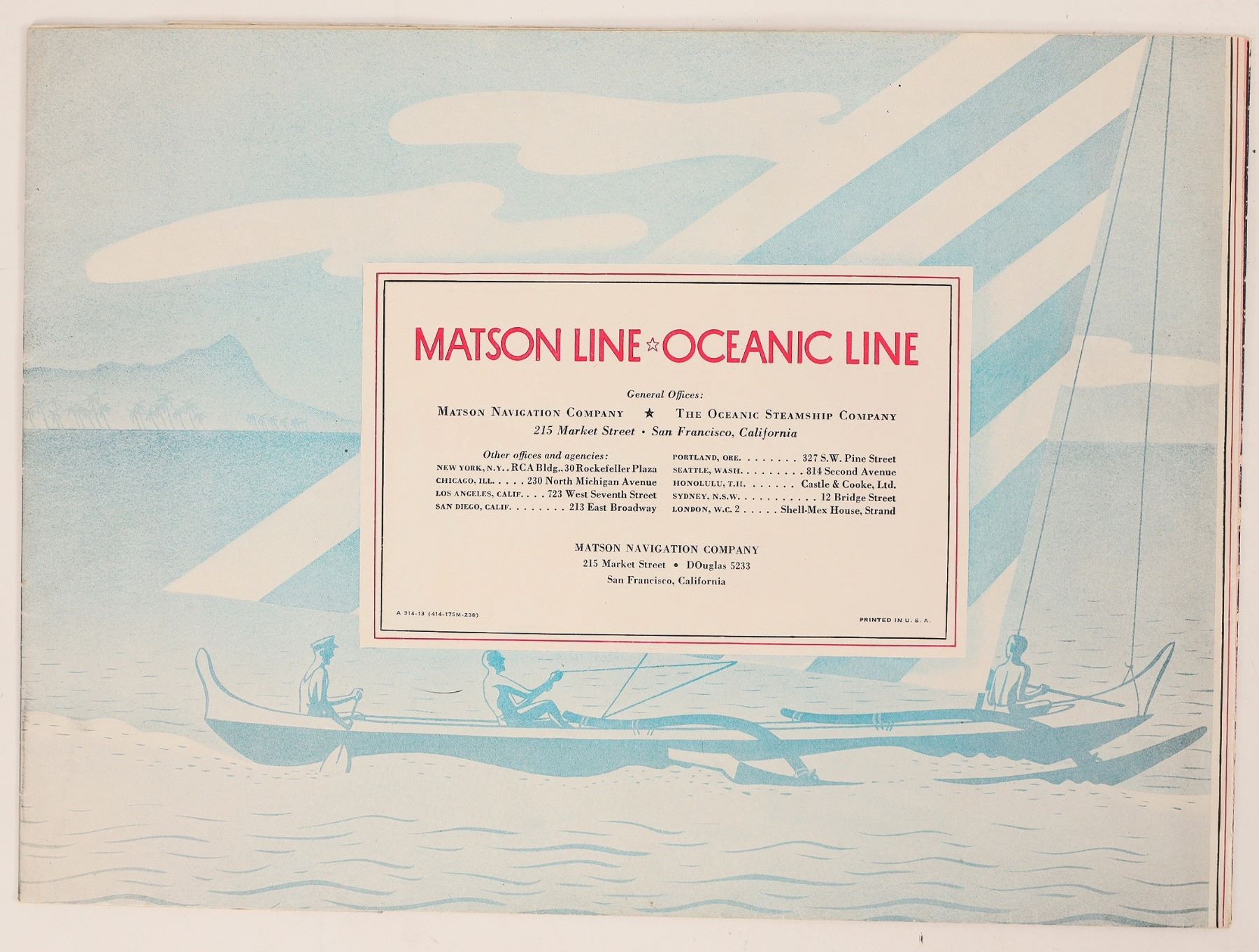 A travel poster for Hawaii & the South Pacific, c1938. "Matson Travel Offerings *Summer 1938*" is a fold-out poster for the Matson & Oceanic lines of the Matson Navigation & Oceanic Steamship companies in San Francisco. Pictures of models dressed in vintage clothing, & native Hawaiians, alongside text providing information on cruises. 13" x 9.5" when folded, 30" x 38" unfolded. [ Hawaii