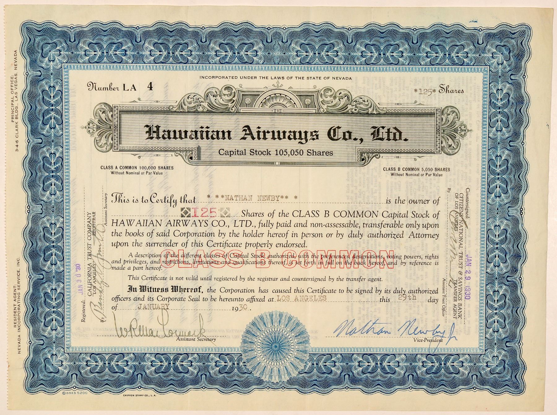 Inc. in Nevada. No. LA4, issued for 125 shares to company president Nathan Newby on Jan. 29th, 1930. Signed by Newby and the assistant secretary. Not cancelled. Blue border, black print, fancy logo. 8.75 x 11.75" Folds, creases. Principal office in Las Vegas. Could not locate any information about this company. Ken Prag Collection