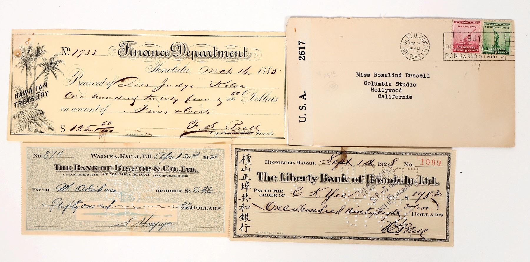 Three vintage Hawaiian checks and a World War Two postal cover. The cover is addressed to Miss Rosalind Russell / Columbia Studio / Hollywood, postmarked Honolulu, September 1942 from Jane Yamada, inspected by the censor. Checks: 1) Hawaiian Treasury Finance Department dated Honolulu 1885; received of Judge Koloa $125. 2) The Bank of Bishop & Co. Waimea, Kauai, dated 1925 payable to M. Okihara. 3) The Liberty Bank of Honolulu Ltd. dated 1928 payable to C. K. Yes, $198.30 with Chinese characters at left.