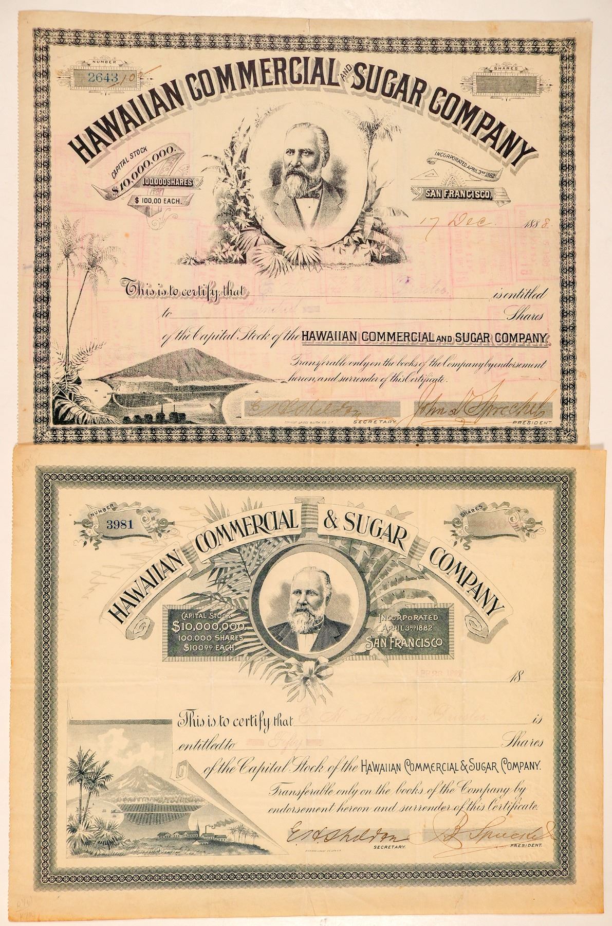 Lot of 2 different varieties for the same company. Inc. April 3rd, 1882 in San Francisco. 1) No. 2643, issued in 1888. Cannot read who it was issued to (ink faded). Signed by John Spreckels and secretary Shelton. Not cancelled. Black border and print. Two vignettes: portrait of Claus Spreckels (a major Hawaii industrialist) and view of plantation and island. Folds, small separation, toning. 8.5 x 11" 2) No. 3981, issued in 1892. Same corp. signatures and similar vignettes as the other. Ink also faded. Pinholes, folds, toning. Similar design to first. This company was incorporated by Claus Spreckels and Hermann Schussler (engineer who did the Comstock water system in Nevada). In 1878 Spreckels founded Spreckelsville, a company town along the northern shore of Maui. By 1892, Spreckelsville was the largest sugarcane plantation in the world and employed thousands of immigrant farm laborers from Japan, Korea, China, and other countries. This company was taken over by Big Five Hawaii capitalists Alexander & Baldwin in 1898. Ken Prag Collection