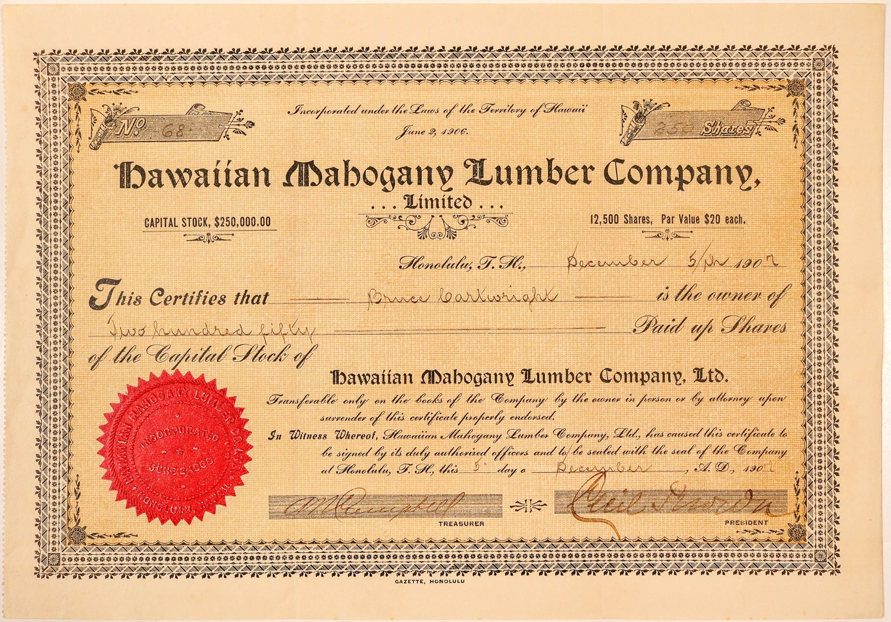Inc. in the Territory of Hawaii, 1906. No. 68, issued for 250 shares to Bruce Cartwright on Dec. 5th, 1907 in Honolulu. Signed by president Cecil Irwin and treasurer AM Campbell. Not cancelled. Black border and print, red seal, orange background. Folds, some toning. Printed by the Gazette in Honolulu. 8 x 11.25" In 1907, the Hawaiian Mahogany Lumber Company established a mill at Pahoa, island of Hawaii. This mill could produce 2,500 ohia railroad ties per day for export to California. The company agreed to ship the Santa Fe Railroad 90 million board feet of ohia railroad ties. It also exported small amounts of koa lumber, called Hawaiian mahogany. A fire destroyed the mill in 1913; they closed down completely in 1917. [Ref: USDA] Ken Prag Collection