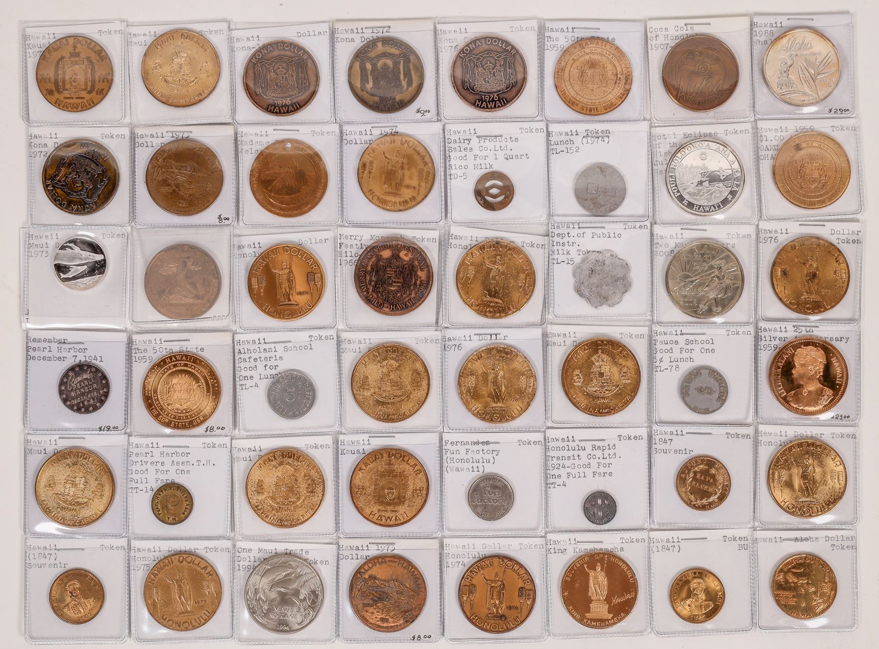 Lot of over 45 tokens and medals from the Land of Aloha. Trade dollars from Maui, Kona, Oahu. About ten trade tokens, 1847 souvenir restrikes of the Hapa Haneri (3); Pearl Harbor commemorative, 1959 statehood medal. Hawaii