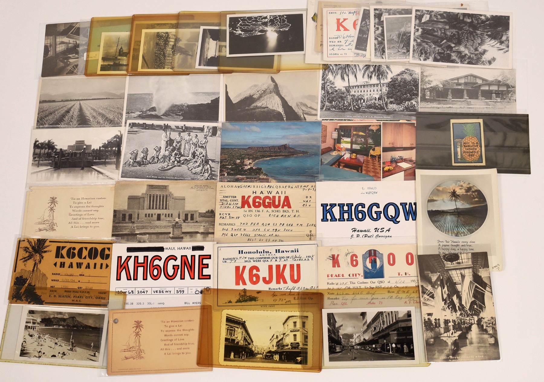 Lot of about 40 postcards and photographs from Hawaii. Short wave radio postcards, buildings, mountains, ocean views.