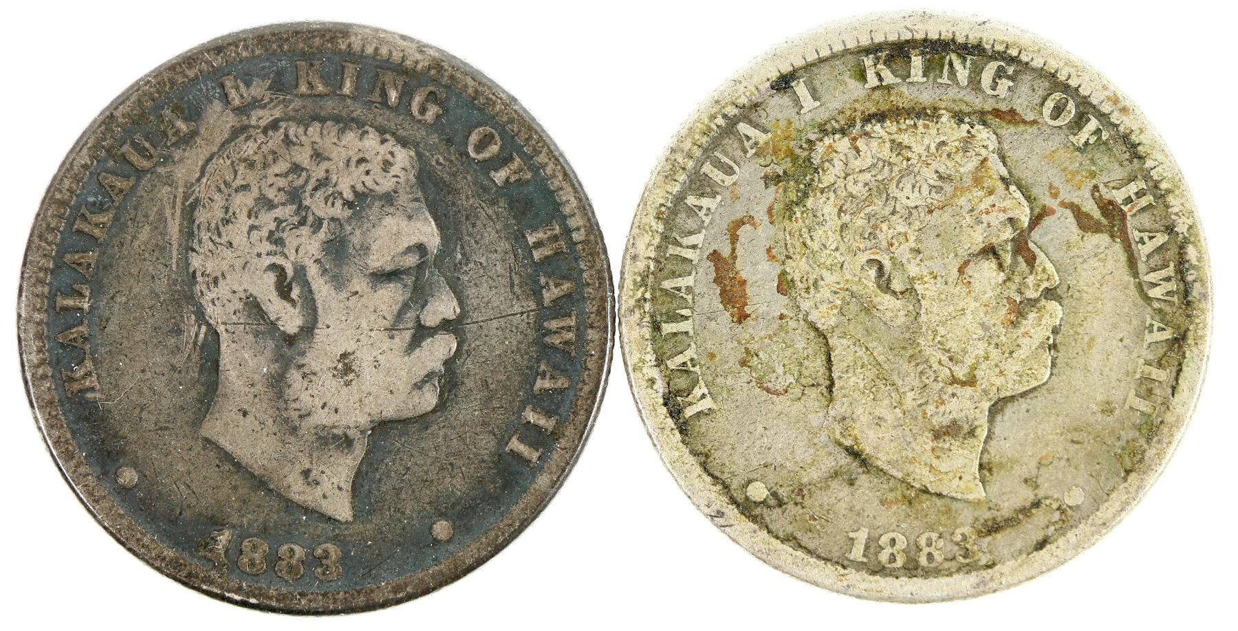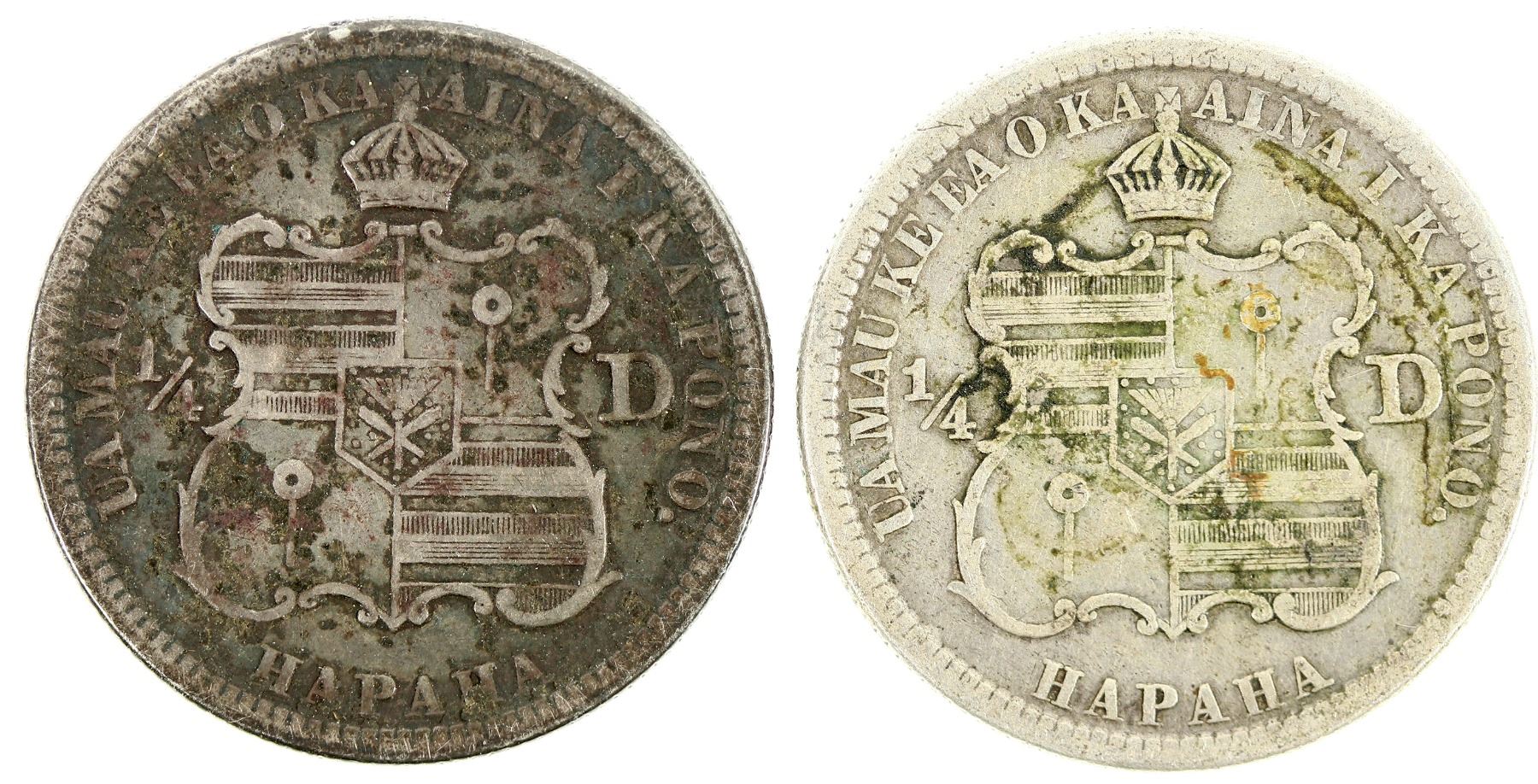 Obv.: Bust of King Kalakaua I facing right / KALAKAUA I KING OF HAWAII / 1883 . Rev.: Crowned Arms (Main features: The quartered shield has in the 1st and 4th quarters; the red, white and blue stripes representing the eight inhabited Hawaiian islands. The 2nd and 3rd quarters have two emblems of taboo. The inner escutcheon has crossed spears and the shield in surmounted by the Crown of Hawaii. UA MAU KE EA O KA AINA I KA PONO. / ¼ D / HAPAHA (Translation: The life of the land is perpetuated in righteousness)