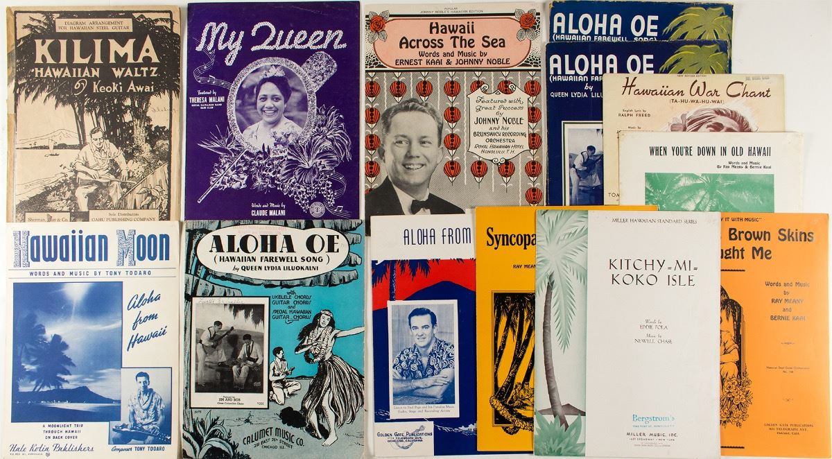 Large collection of 215+ gorgeous color Hawaiian songbooks from many different categories. 1) Assorted larger variety: 93 (13.25" x 10.25"), 2) Assorted smaller variety: 73 (12" x 9"). 3) Hawaiian music for Hawaiians: 20, published in Hawaii, c.1890s. 4) Hawaiian composers: 14, smaller size; 19 larger format. Fair to good condition. Please inspect. (Prag Collection) City: State: Hawaii Date: hwac# 34306