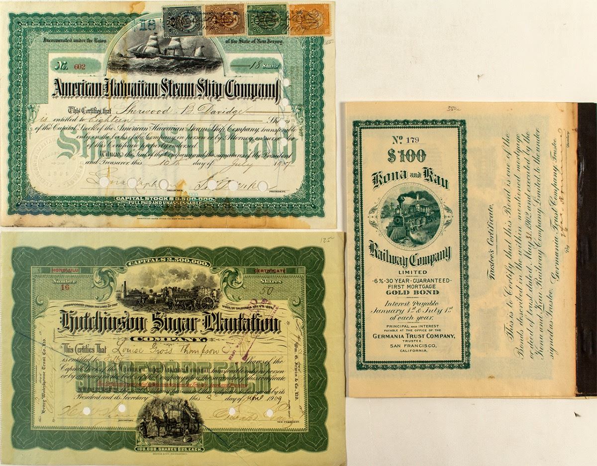Lot of three. 1) Stock for American Hawaiian Steamship Company. Issued 1907. Punch cancelled. Four different revenue stamps attached. 2) Hutchinson Sugar Plantation Company. Stock issued 1909. Punch and stamp cancelled. Two plantation vignettes. 3) $100 bond for Kona and Kau Railway Company. Issued 1902. Not cancelled. 59 coupons attached. Locomotive vignette. (Prag Collection) City: State: Hawaii Date: 1902-1909 hwac# 34161
