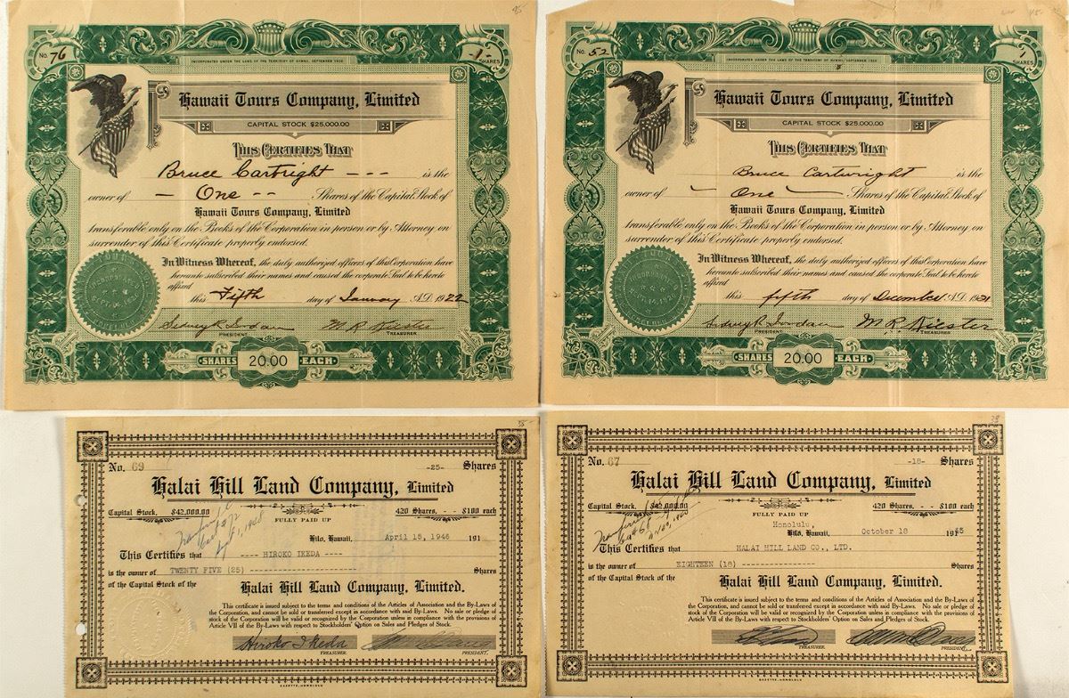 Four certificates from two companies. 1) Hawaii Tours Company. Inc. in Territory of Hawaii. Two issued, No. 52 (1921) and 76 (1922). Both not cancelled. Green border and eagle on flag vignette. Printed by Honolulu Star-Bulletin. Deep folds with some separation. 2) Halai Hill Land Company. Inc. in Hilo, Territory of Hawaii. Two issued, No. 67 (1945) and 69 (1946). Pen and punch cancelled. Ornate border, no vignette. Printed by Gazette, Honolulu. Folds and light toning. (Prag Collection) City: State: Hawaii Date: 1921-1946 hwac# 34142