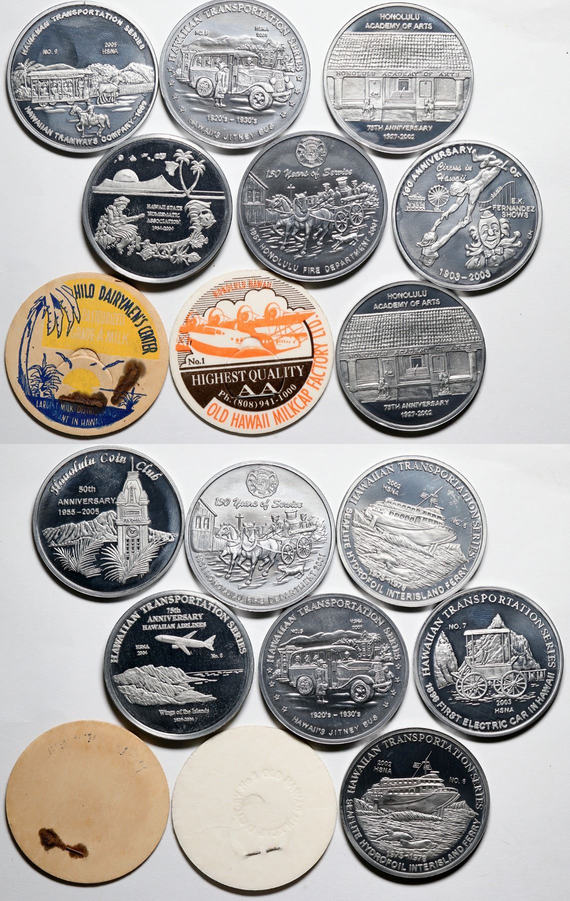 Lot of seven white medals commemorating modes of transportation in Hawaii. 40 mm. Topics include: 75th Anniversary of Hawaiian Airlines, Seaflite Hydrofoil Inter Island Ferry, Hawaii's Jitney Bus. Also two Hawaiian Milkcaps.