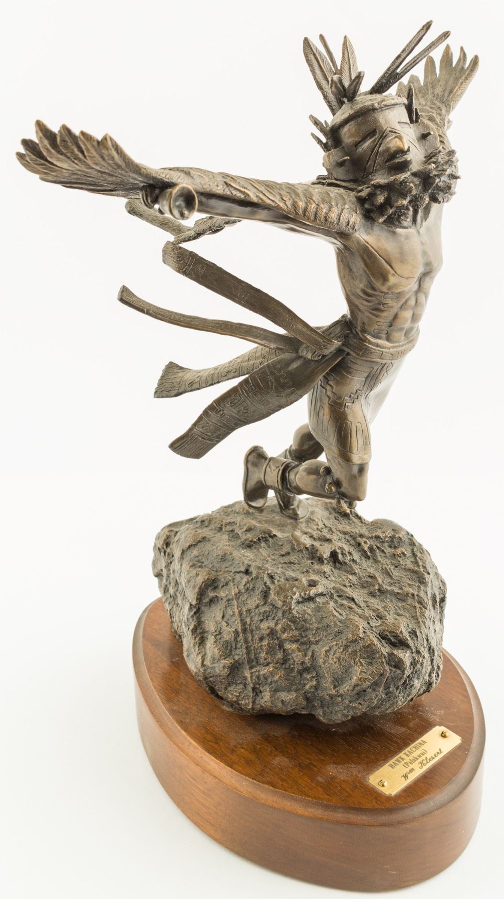 Lively, elegant bronze sculpture of the hawk kachina by William Martin Klesert, (1928-1996). sculpture is #4 of 30. 12" 10" w x 8"d on a swivel wood stand 1.5" high. Signed on lower side of bronze. A painter for many years, after a stroke, Klesert became a bronze sculptor before suffering a debilitating stroke in 1989. Information included with sculptures. State:Arizona City:Tucson Date:1984 ID# 47556