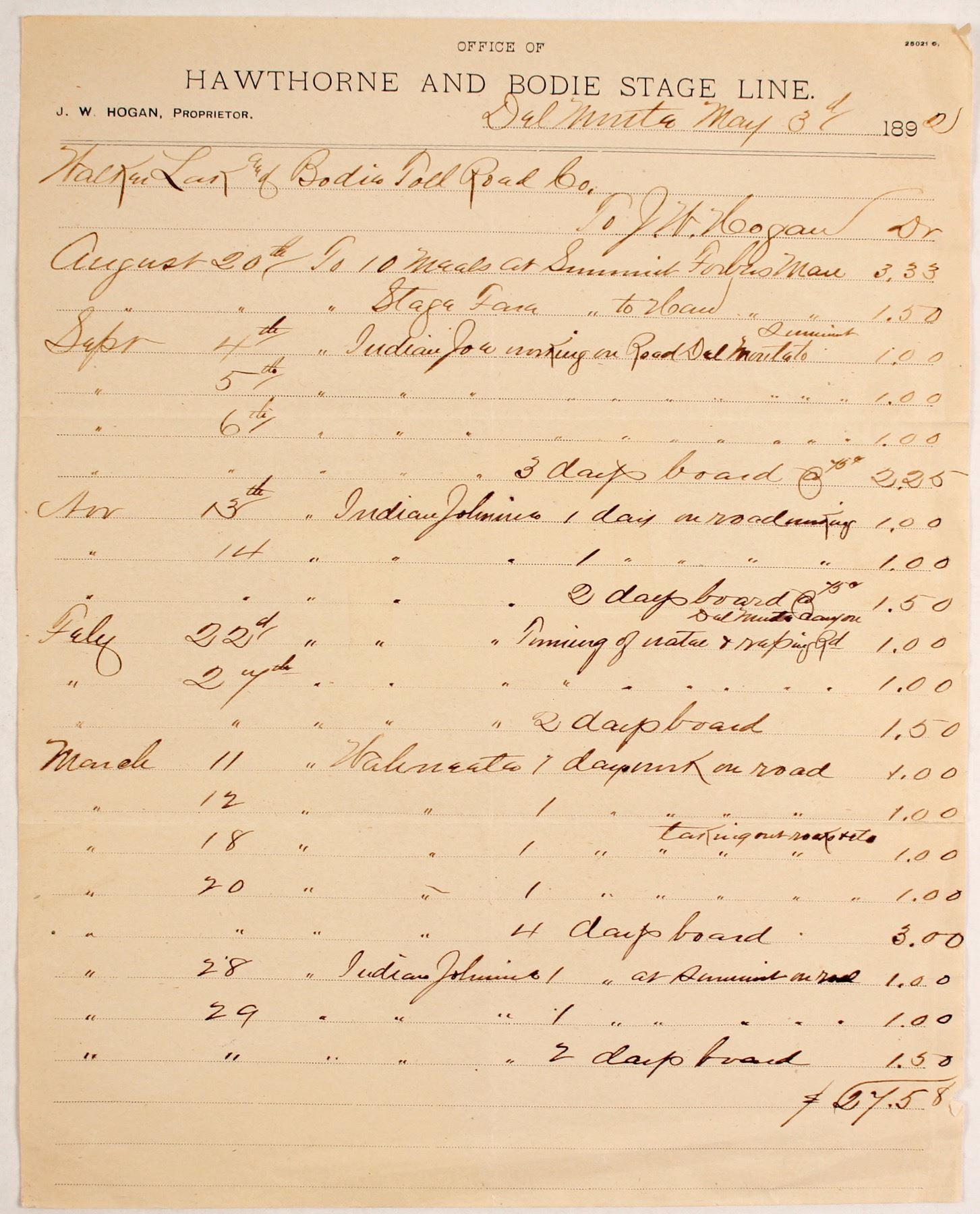 Billhead to Del Monte. Del Monte is not listed in Nevada Place names. It was a mining camp associated with the Del Monte Mines in Aurora which can be found in Stan Paher's Nevada Ghost Towns & Mining Camps. Named as such this route is not listed in Sue Silver's Mineral County #3. We are unsure how this line is related to the Bodie and Walker Lake stage line as listed in Silver. We did find one reference to this route from the Candelaria True Fissure, August 15, 1886, "Hawthorne and Bodie Stage Line...Mr. Monroe, the proprietor, has supplied new coaches and fast stock and everything is conducted in a safe and systematic manner." [Sue Silver] Date: 1892 City: Bodie State: California HWAC# 76052