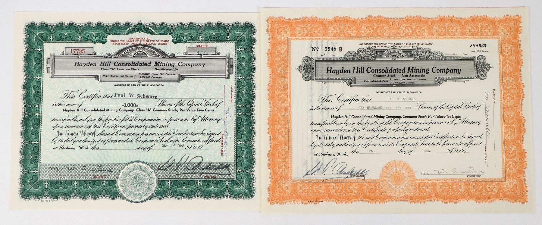 Lot of 2 different. Issued in 1951 and 1968, not cancelled. The Hayden Hill Mining District is in northwestern Lassen County, 65 miles north of Susanville. Hayden Hill was established in 1871 (originally as Providence City). This company appears to be the only one working in the area post-1911. (https://westernmininghistory.com/articles/542/page1/)