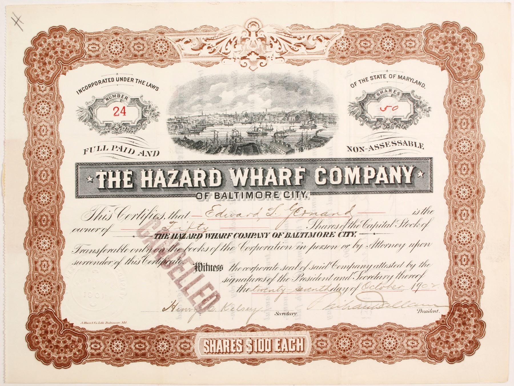 I/C #24 Edward Leonard 50 shares 1902 signed by President illegible. Ships in harbor vignette. Inc. 1902 and operated 9 acres with 1100' of frontage in the upper harbor of Baltimore, MD. Prag Collection. State: Maryland City: Date: 1902 HWAC# 83439