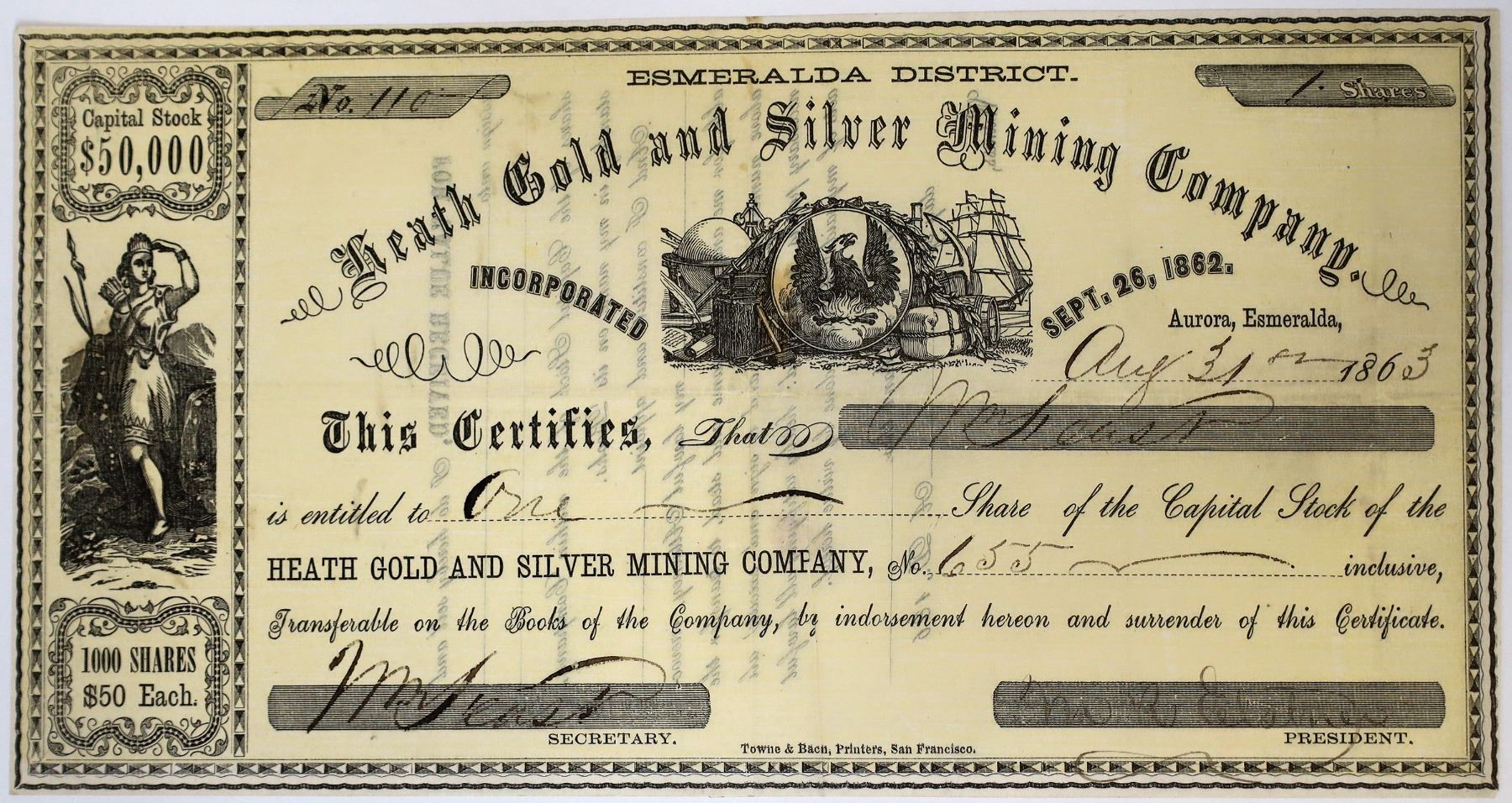 Not many stocks from this area proclaim to be in Nevada. Most say Mono County, California or are just left blank. California had provided the officials, but in 1863 the area would be proven to be in Nevada. # 110 for 1 share to William Feast. Signed by secretary Feast and president M. R. Elstner. Dateline Aurora, Esmeralda, August 31, 1863. Incorporated September 26, 1862. Not cancelled. Allegorical vignette and steamship/ wharf/ phoenix/ globe/ etc. Towne & Bacon printer. Heavy center vertical fold with wrinkles and one discoloration spot by eagle. Other than a one week discrepancy in incorporation dates, I could find nothing about this mine. Feast was the first and only Mono County, California treasurer stationed at Aurora. When it was discovered Aurora was in Nevada, he continued as treasurer. Elstner was a true California 49er, Aurora mining operator and superintendent of the Morgan Mill on the Carson River. Notes on Feast and Elstner included.