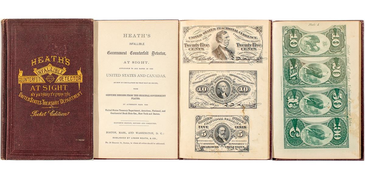Good condition, eleventh edition, published by Laban Heath, & Co., Boston, MA. (6.75" x 4.5") 40 pp., 12 pp. illustrations. Original maroon hard cover, beautiful lithographic illustrations. "I am, through the kindness of the Secretary of the Treasury, enabled in this new edition to give fac-simile cuts and dies fro nearly all the Government issues, thus placing in the hands of all the means of detecting the most skillfully prepared counterfeits that can be executed."