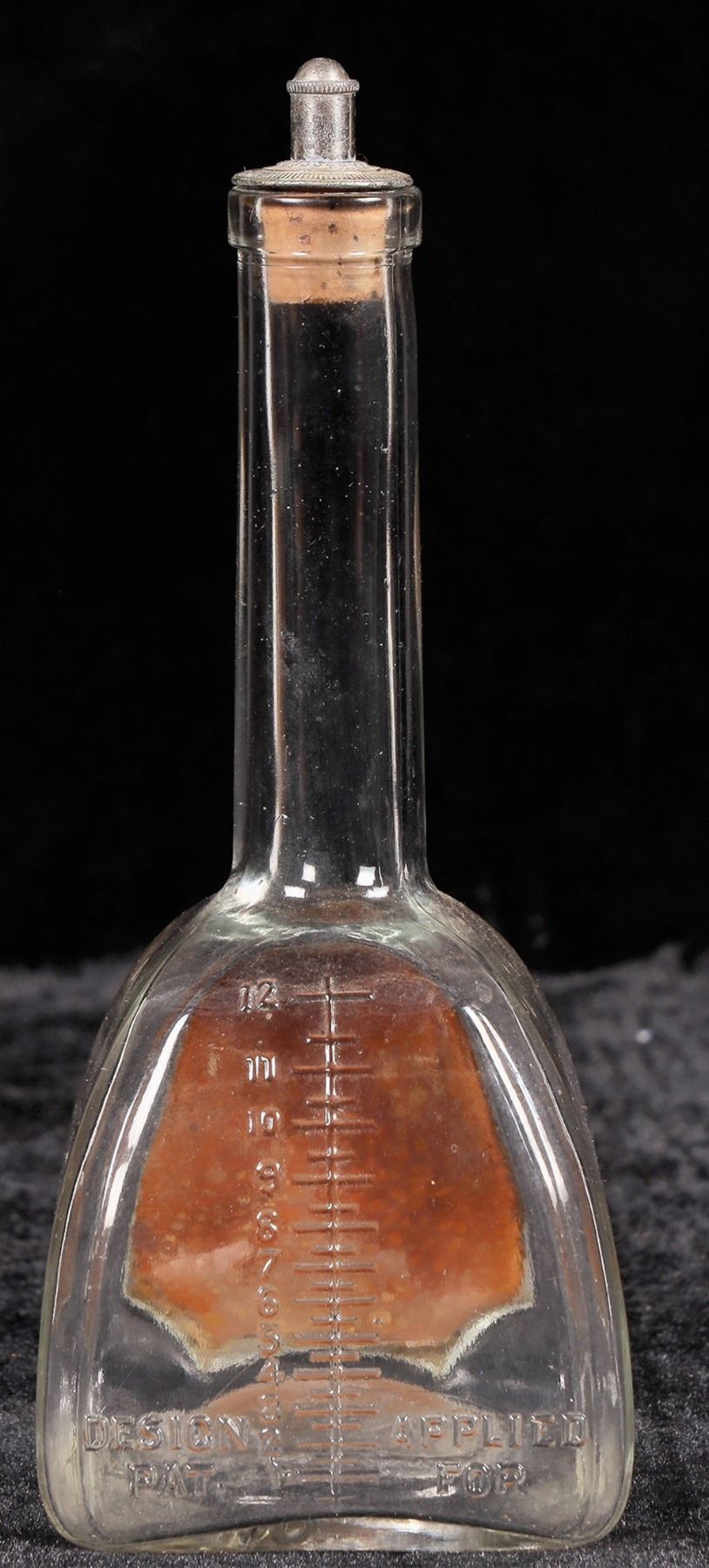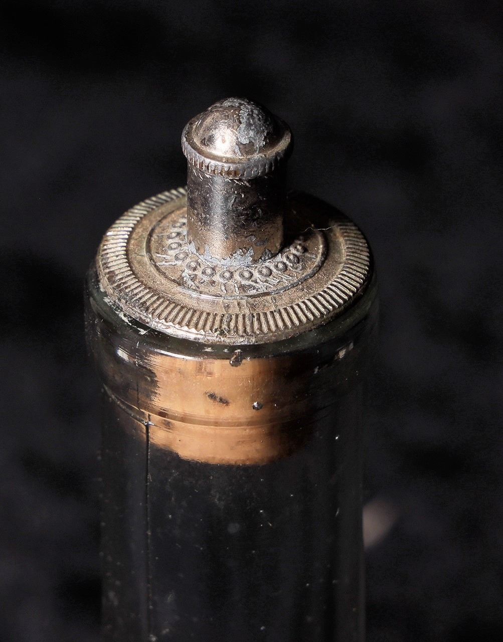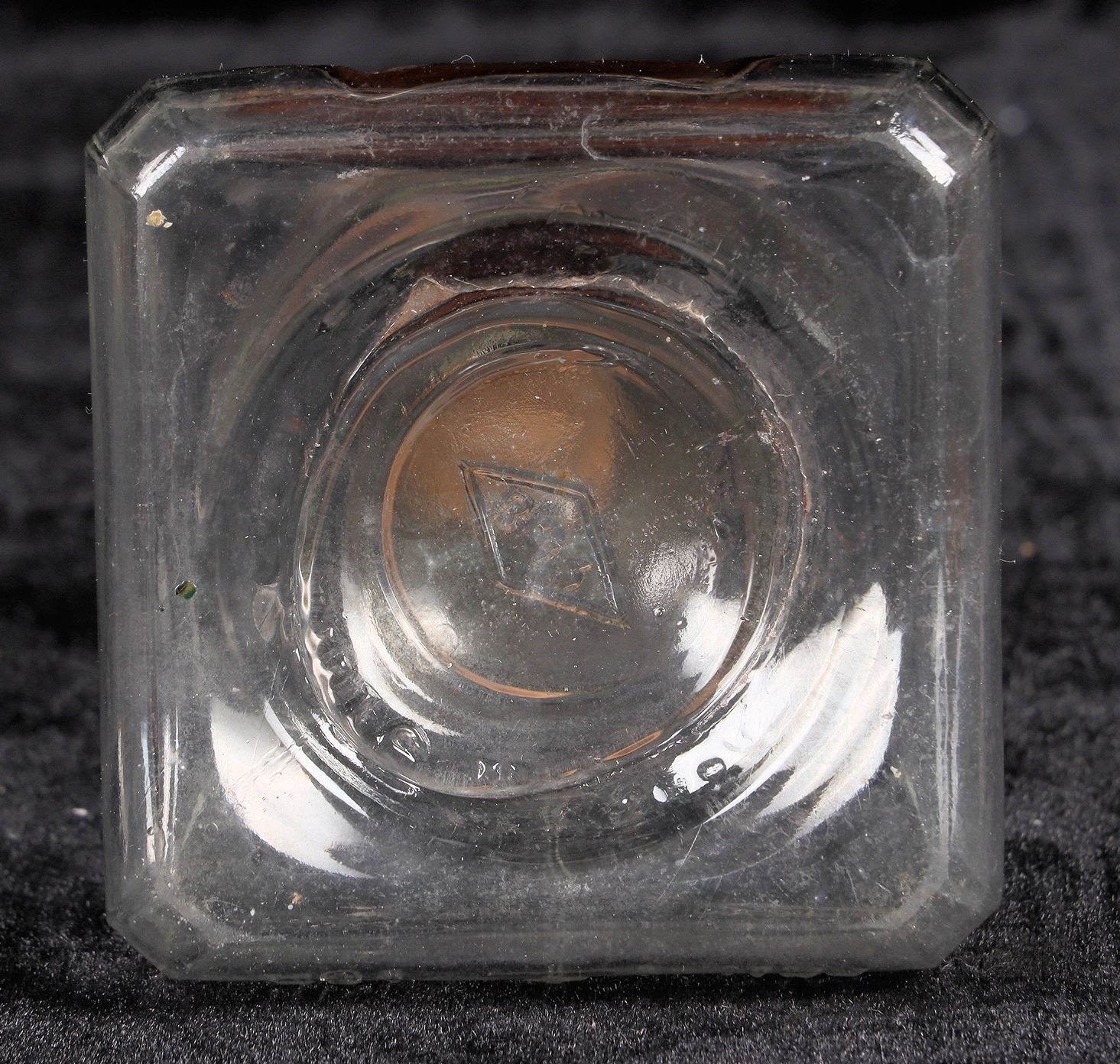 Rare c. 1900 Heather Bloom toilet water bottle with unusual label under glass. No apparent chips or cracks.