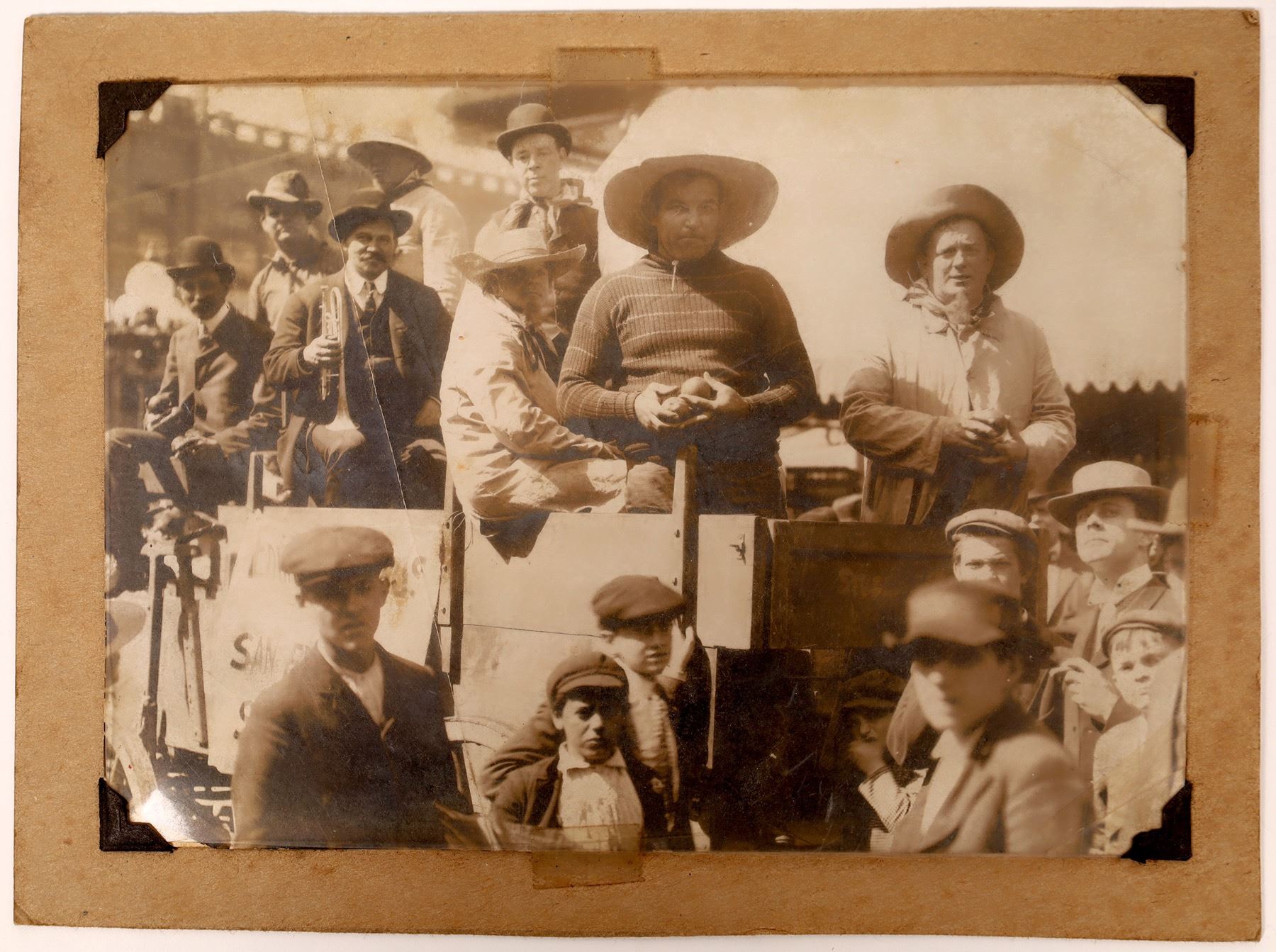 Sepiatone photograph of heavyweight champion James J. Jeffries selling oranges from his Burbank ranch at $20 each to benefit the victims of the Earthquake and fire, San Francisco, April, 1906. Mounted on cardboard by paper corners, photo is 7 x 5 inches.