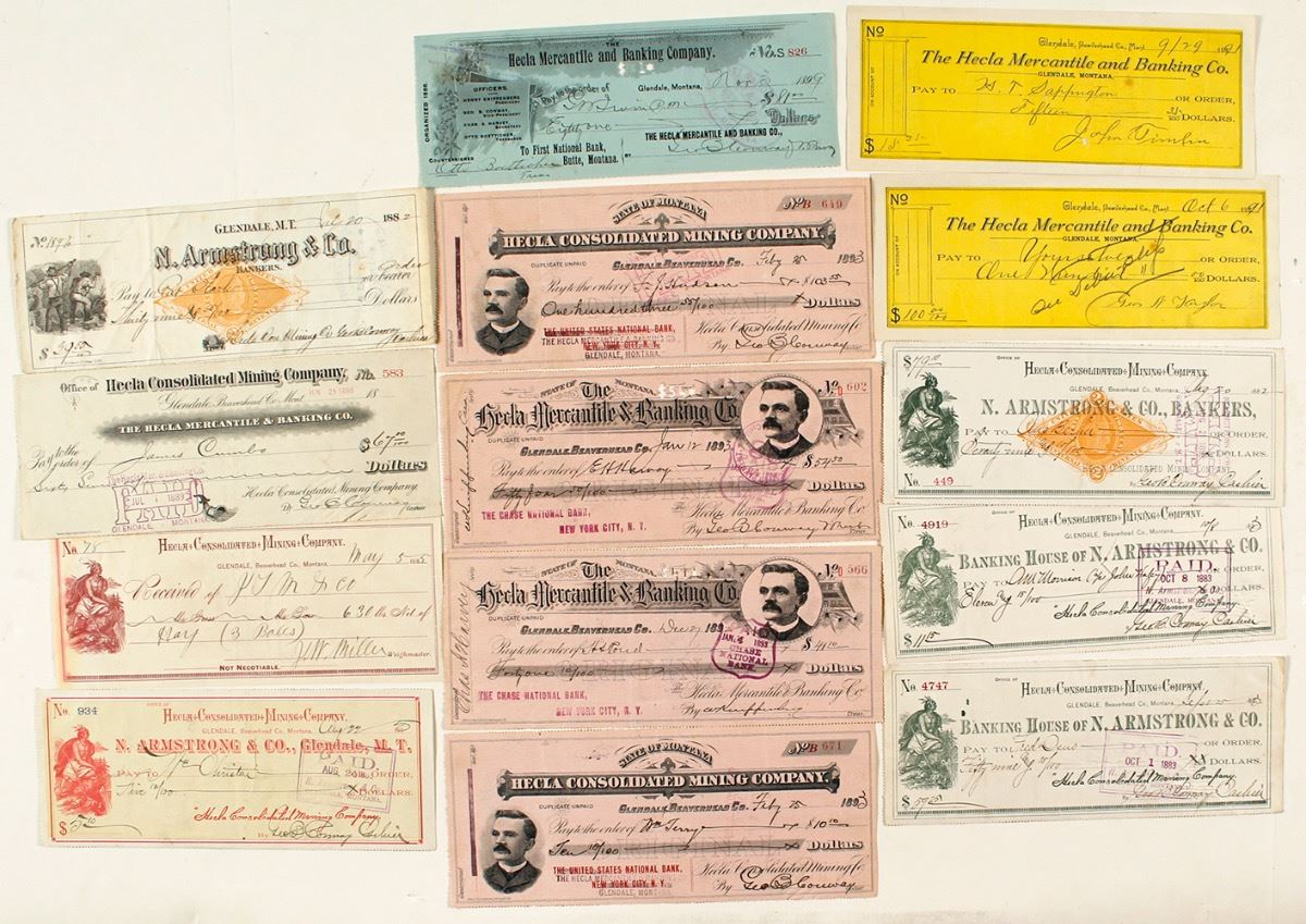 Lot of 16 checks. Includes N. Armstrong & Co. (1882, RN-G, mining pictorial, signed by Hecla Cons. Mining Co.) and three other Armstrong & Co. Hecla Cons. Mining Co. w/ RN-G (1882, Native American vignette) and one without RN (1885, Native American vignette). Eight other checks, five different types: 1885, 1889, two 1891 (yellow Hecla Mercantile & Banking Co.), two 1893 (pink Hecla Cons. Mining Co. w/ pictorial portrait), two other pink Hecla Mercantile & Banking Co. (1892-93 w/ portrait), and blue 1899 Hecla Mercantile & Banking Co. The Mercantile Company was a subsidiary of the mining operations. City: Glendale State: Montana Date: 1882-1899 ID: 36671