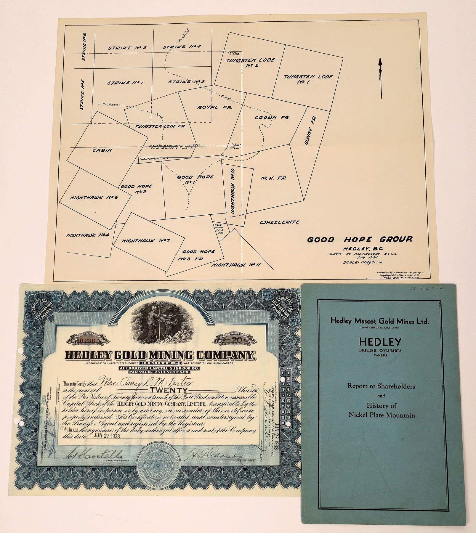 Stock D236 for 20 shares in 1933. Nice blue border. Holes for storage, otherwise very nice! Hedley prospectus. 8 pages with fold out map – 16 x 12". For the Good Hope Group. Located in the Osoyoos Mining Division.