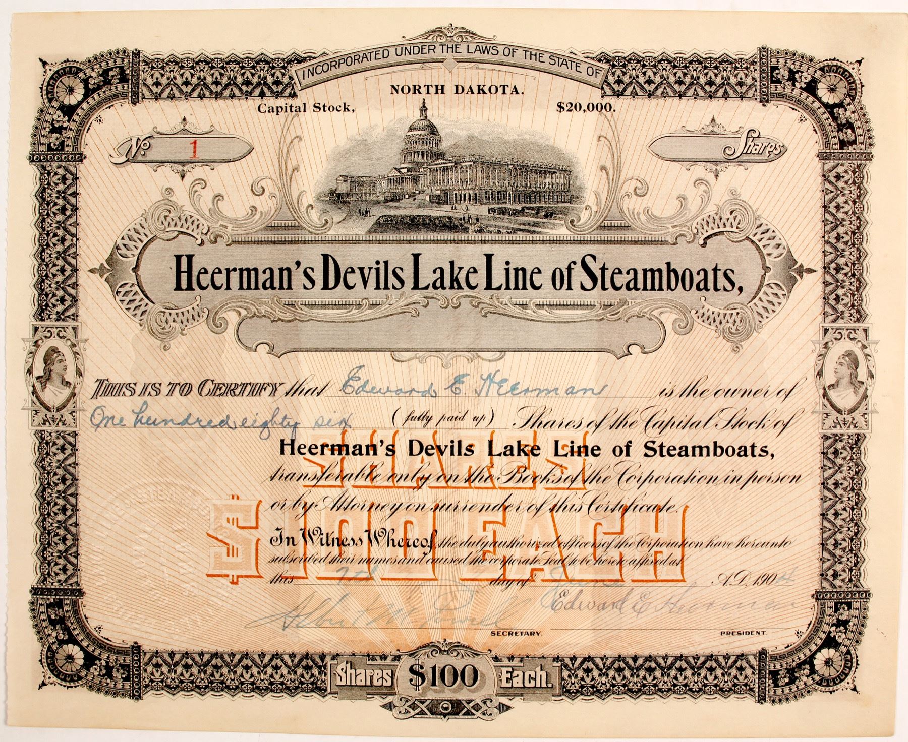 I/U #1 Edward Heerman 186 shares 1904 signed by President Heerman. No creases, the best of the Heermans! Prag Collection. State: North Dakota City: Date: 1904 HWAC# 83436