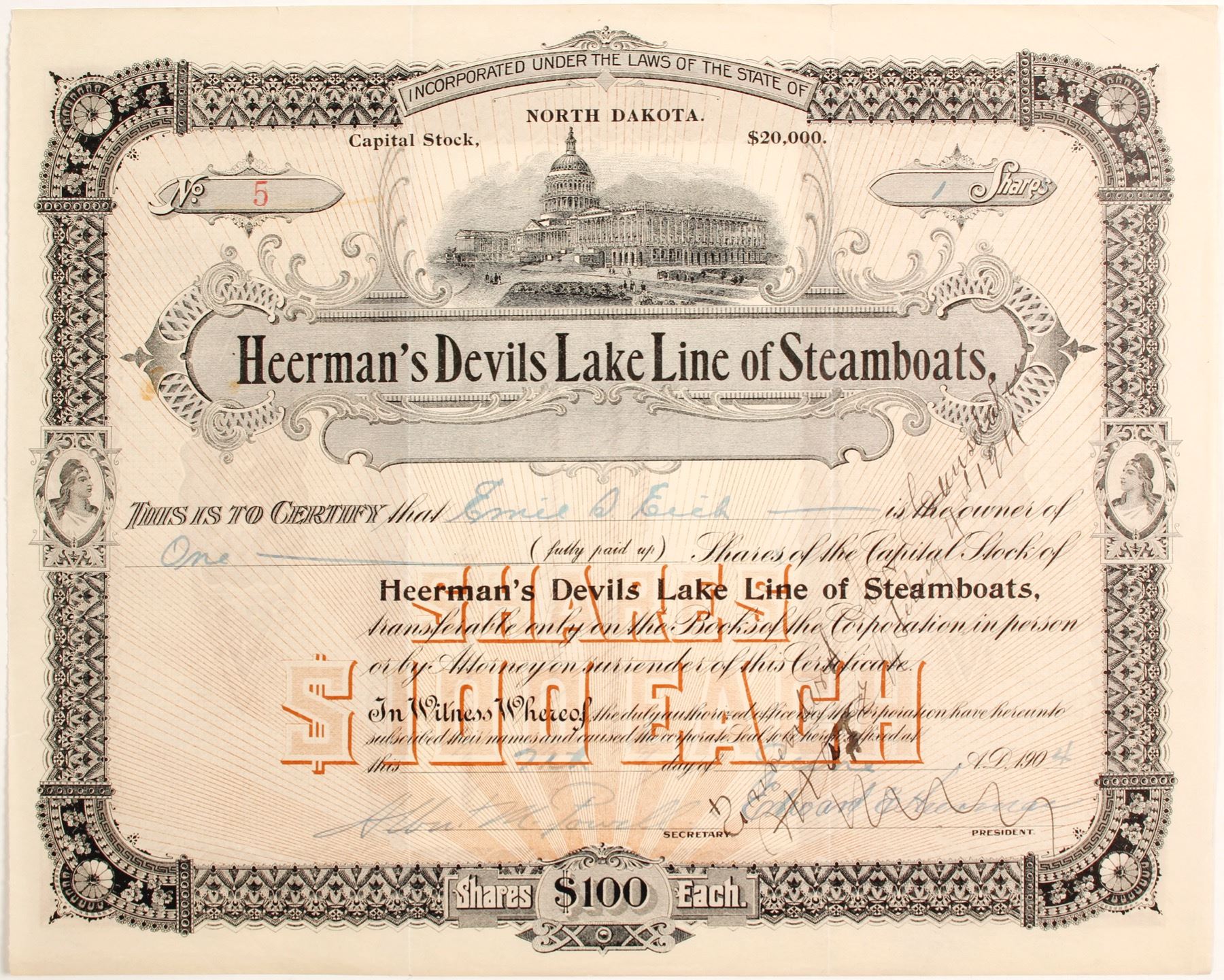I/C #5 Ernie Eich 1 share 1904 signed by President illegible. "From this home, at the age of 16, Captain Heerman started out on his own. Carrying all of his worldly possessions in a small bundle & with but a few cents in his pocket, he started for the shores of the Mississippi river, for he had decided to seek his fortune on the river.At the age of 19, he was in command of his own steamboat on the river. The first of a fleet of 13 steamboats which he owned and operated on the Mississippi and Chippewa rivers. Almost all of his boats were named in one way or another for his only daughter, Minnietta Heerman, later Mrs. Minnie H. Naugle of Devils Lake." from http://tourism.devilslakend.com. Prag Collection. State: North Dakota City: Date: 1904 HWAC# 83438