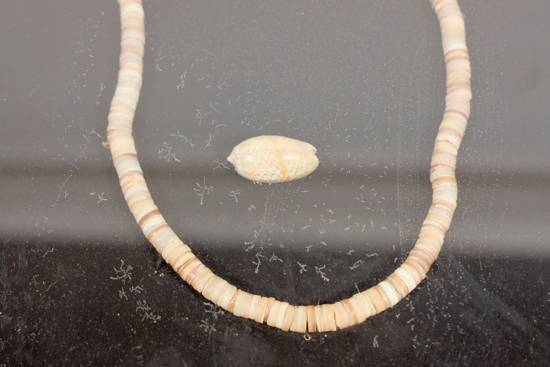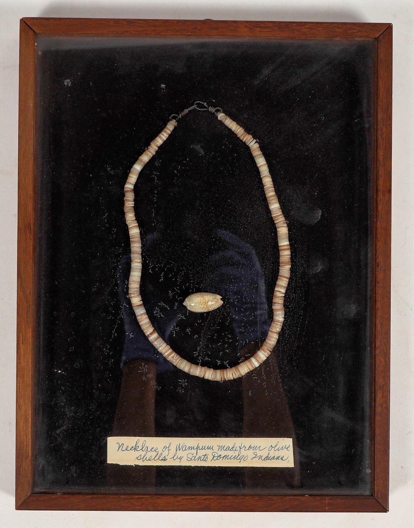 Heishi (Olive) Shell Necklace Authentic Santa Domingo Indian Jewelry. About 16" long. This authentic, antique Native American piece is a beautiful example of shell work by the Santa Domingo Indians. Santo Domingo Pueblo people (also known as Kewa Pueblo) primarily use local materials like turquoise and spiny oyster, along with olive shell (heishi), for their traditional jewelry. Olive shells are used to make fine, hand-rolled beads, a technique known as heishi. Santo Domingo Pueblo, also known Kewa Pueblo is a federally recognized tribe of Pueblo people in northern New Mexico. This necklace has a steel wire closure, characteristic of pieces made from the mid-20th century to the 1970s and 1980s. This piece is mounted with a Wampum shell and incorrectly labelled as Wampum but it is a lovely example of Native American shell jewelry in a presentation display box/frame.