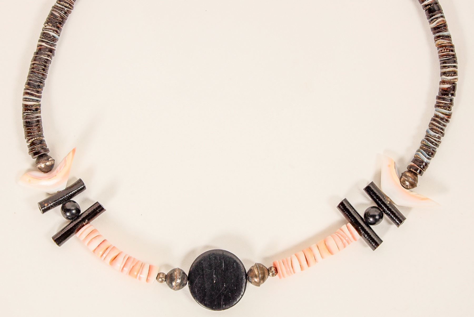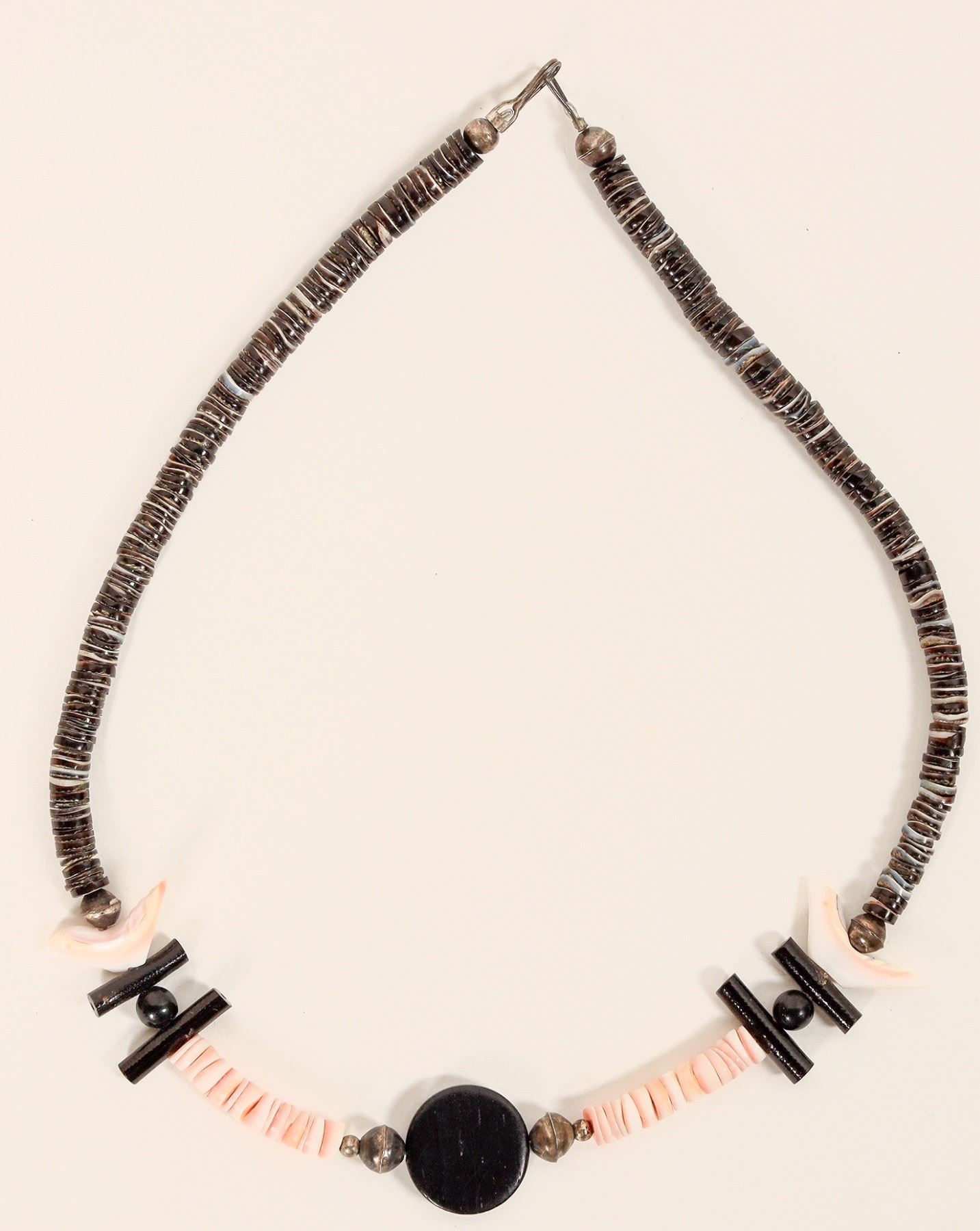 Heishi silver clasp and balls fetish necklace with wood and shell beads. Center round wood bead, perhaps ebony? 16".[