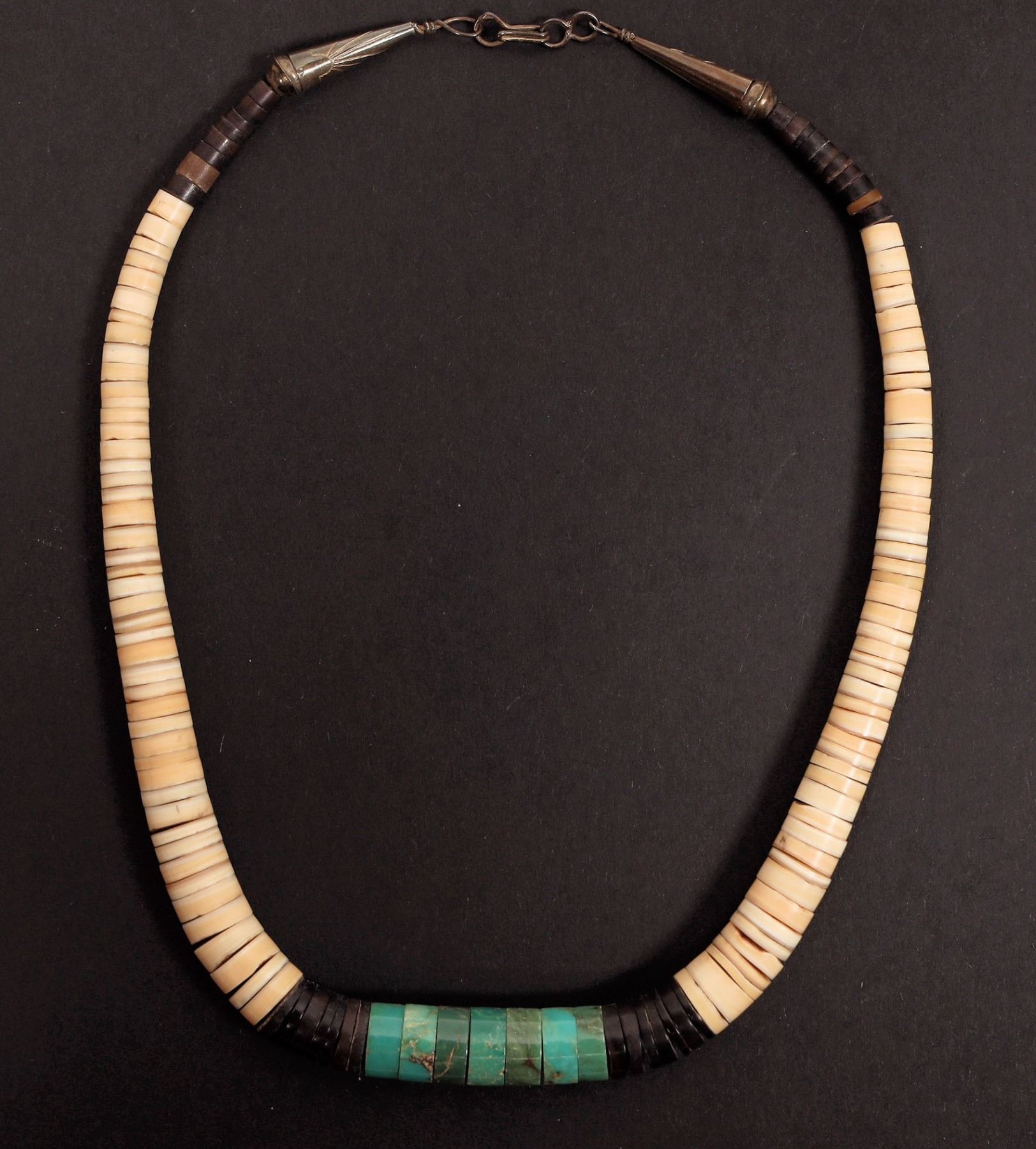 Heishi necklace with silver ends, shell beads and turquoise. 15". [