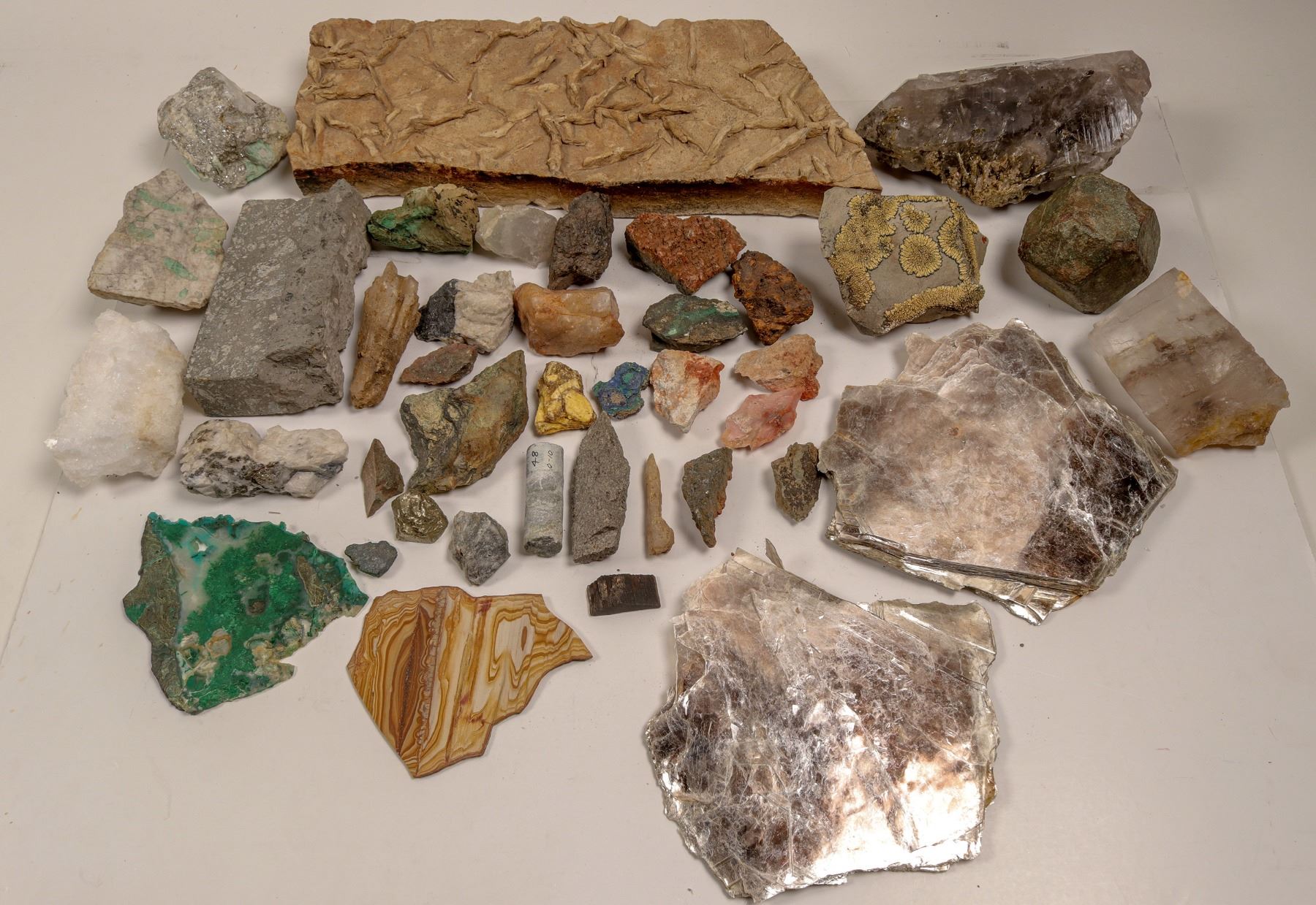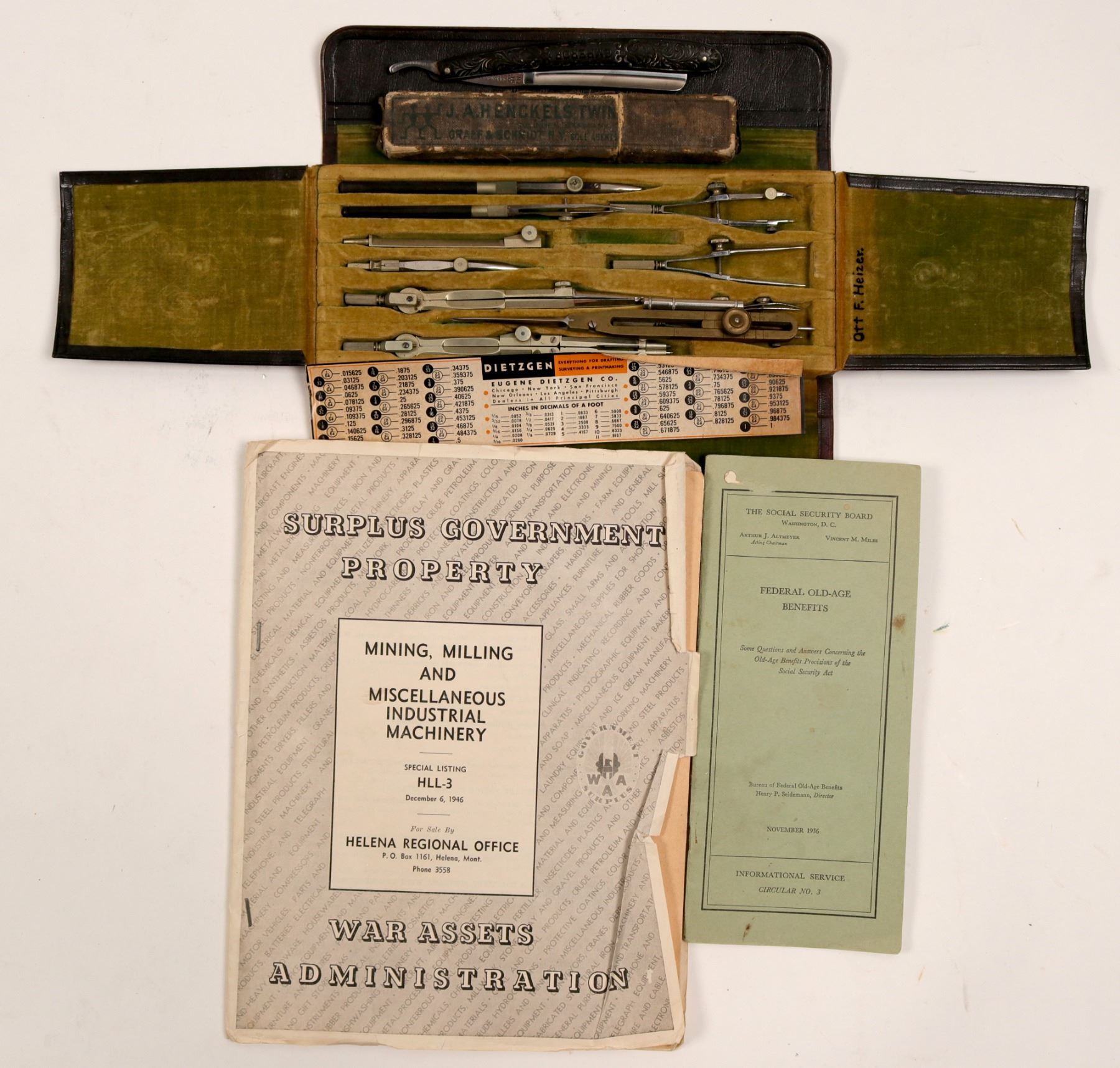 Ore specimens and rocks from Ott and John Heizer, mining engineers in Nevada, c 1908-1965. Most of these rocks, if not all, were unlabeled from the John Heizer estate. The collection includes: Smoky Quartz crystal, about 6" (probably from Incline, NV); two salt specimens; a group of about 20 ore specimens from metal mines, all unlabeled- includes silver and gold ores (no gold visible), copper (probably Robinson pit, Ely); large plate with barite (6 x 15"), beryl (emerald) in pegmatite; large partial crystalline plate of muscovite; large garnet, slab of malachite in quartz, etc. also has some of Heizer's tools- straight razor ans drafting set. Ott Heizer was a member of the first graduating class of Mackay School of Mines and manager of the Nevada-Massachusetts co. at Mill City.