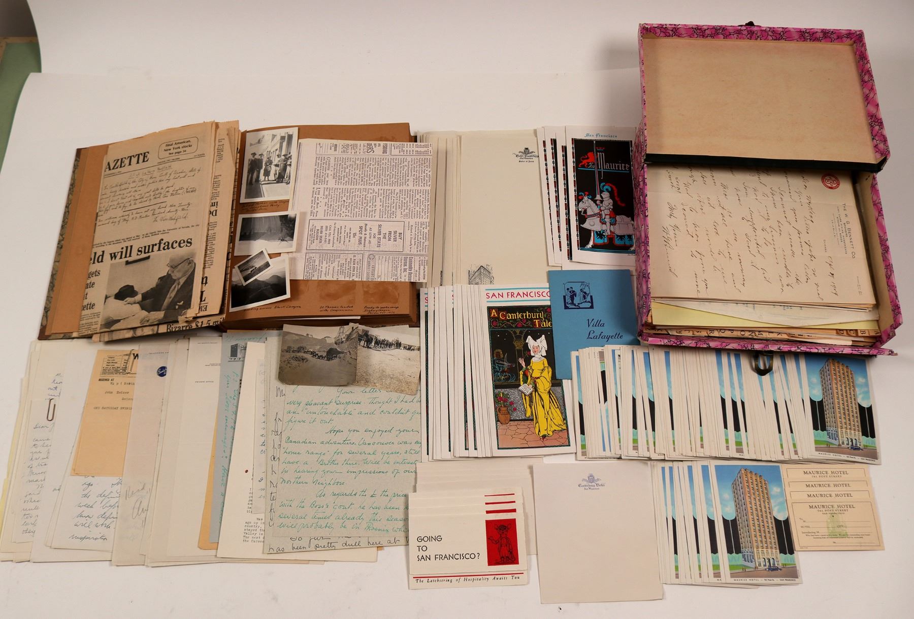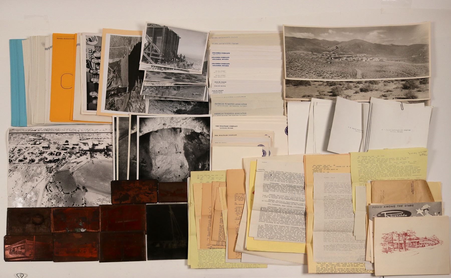 The lot also contains about half a cubic foot of correspondence, scrap book, hotel stationery and photos from the early life of John Heizer, Mining Engineer. Heizer was the son of Nevada Mining Engineer Ott Heizer, manager of the Nevada-Massachusetts Tungsten operation at Mill City. Young Heizer tried his hand at College of the Pacific, accepted in 1929, but soon got the "wanderlust". He tried his hand at the hotel business, ending up in San Francisco. The archive contains a number of letters regarding his job search during a very difficult economic time (market crash and Depression). There are many letters to the young John from Ott trying to encourage his son to "get it together" (writer's interpretation).