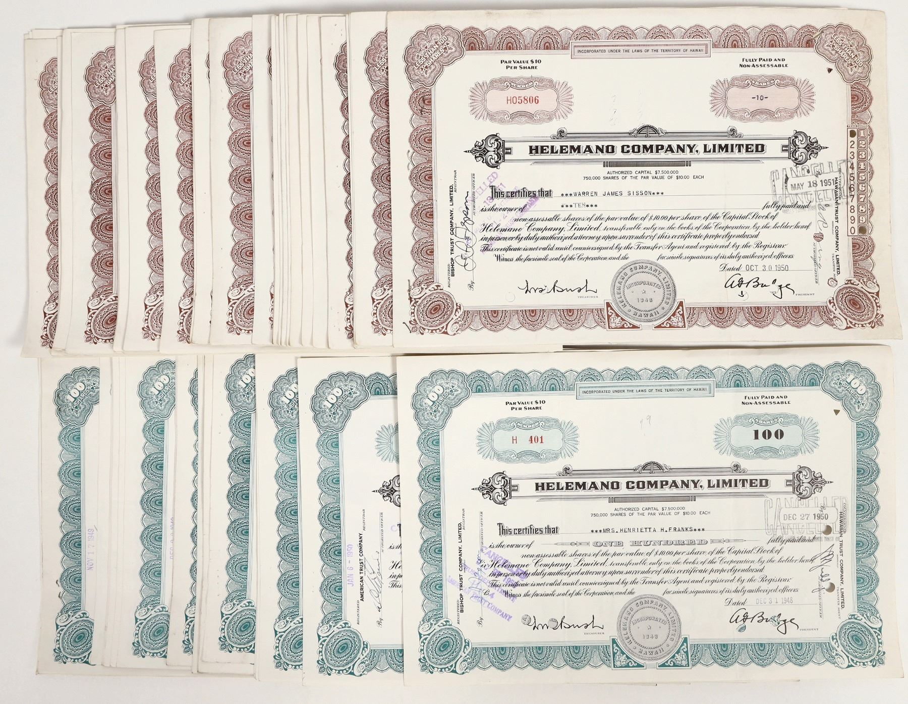 Over 100 Helemano Company, Ltd. Stocks (100+). 2 varieties. Green border and brown border. Issued. c 1950s.