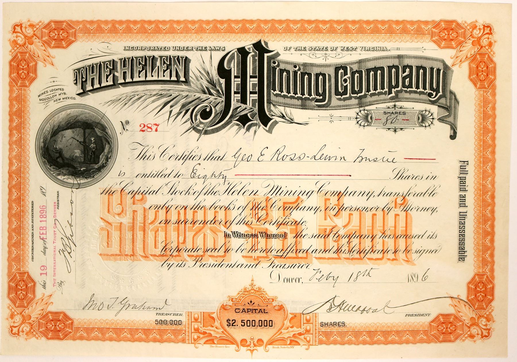 # 287 for 80 shares to George Ross-Lewin trustee. Signed by Jno. Graham and president (?). Not cancelled. Small circular air drill vignette. Homer Lee Bank Note Company printer. Orange and black on whtie. Incorporated in West Virginia, printer in New York, dateline colorado and mines at Mogolllon Mountains in New Mexico. No folds pin holes, edge, corner or discoloration issues. Helen Mining Company operated the mines and the mill in Whitewater Canyon. The mill was powered mainly by electricity. The problem was it could not be built close to the mines. The stream would dry up in the summer. The canyon was very rough making building it higher in the canyon problematic. Ken Prag Collection