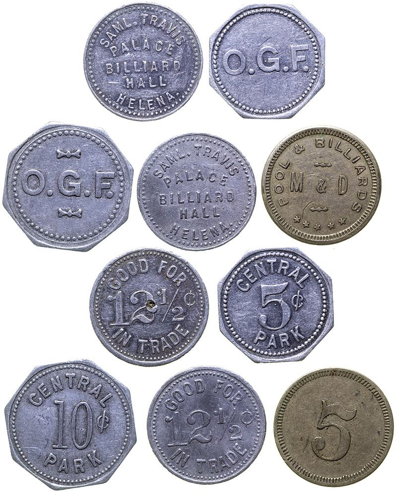 5 Tokens for various billiard halls and O. G. Frederick's Central Park. R-5 Pool & Billiards / M&D // 5. Round, White Metal, 21mm. (2x) R-5 Saml. Travis / Palace / Billiard / Mall / Helena. // GF / 12 1/2c / In Trade. Round, Aluminum, 21mm. R-5 O.G.F. // Central / 5c / Park. Octagonal, Aluminum, 20mm. R-5 O.G.F. // Central / 10c / Park. Octagonal, Aluminum, 22mm. City: Helena State: Montana, Date: Inventory# 39729