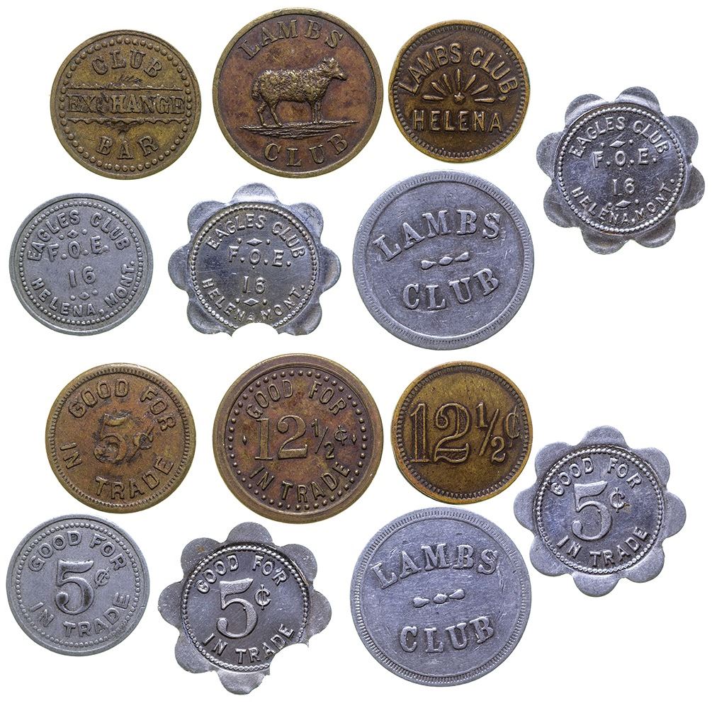 7 Tokens from Helena "Clubs" including an R-6 (pictorial sheep) Lambs / Club // GF / 12 1/2c / IT. Round, Brass, 25mm. R-5 Club / Exchange / Bar // GF / 5c / IT. Round, Brass, 22mm. Others include 2 different R-5 Lambs Club tokens, and 3 R-4's from the Eagles Club. City: Helena State: Montana, Date: Inventory# 39735