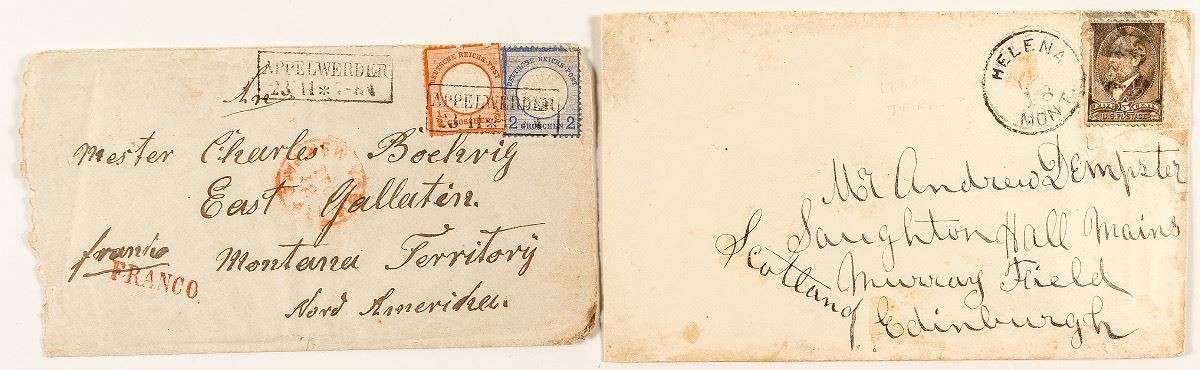 1) 1883 Helena Territorial cancel with cork killer 1883 cancel. To Edinburgh with 5c brown stamp. 2) West Prussia cover sent to East Gallatin, Montana Territory, Nord Ameriker. 2c a 1/2c Deutsches Reich-Post stamps. (Svoboda Collection) City: Helena State: Montana Date: HWAC# 35225