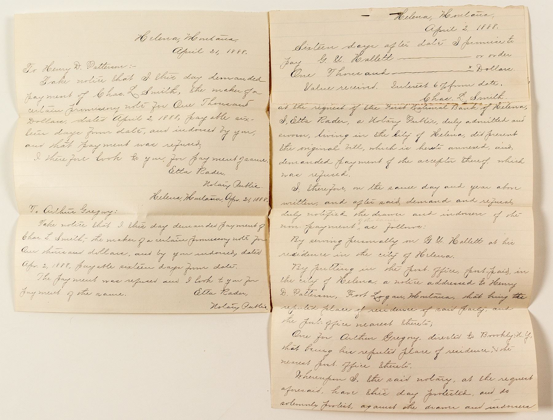 2 Legal documents from Helena Montana. They are both territorial from April of 1888 and hand written concerned with a payment of one thousand dollars for a debt owed, and the passing of a bill. Original territorial legal documents. State: Montana City: Helena HWAC#: 40832 Date: 1888
