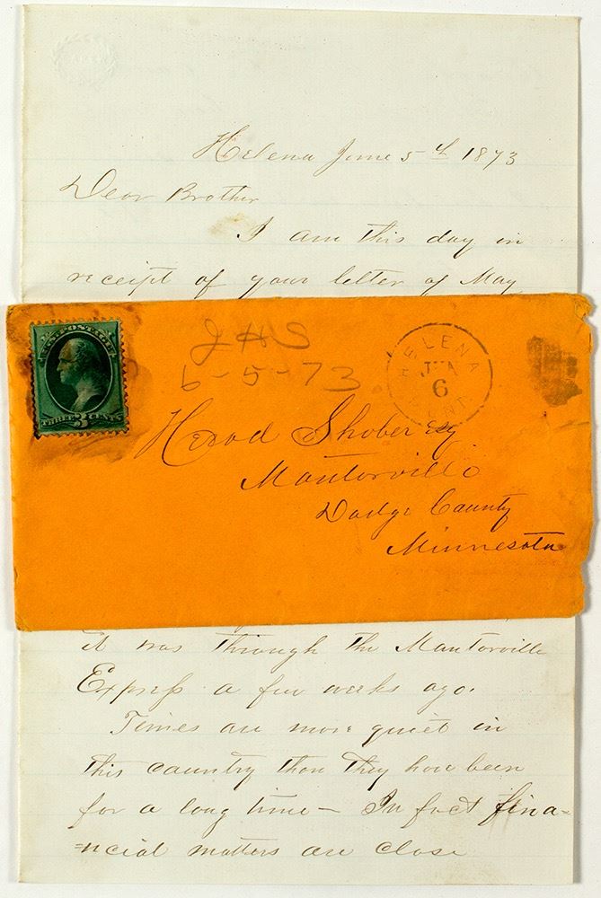 Very nice Helena postal history. Strike is light, but very readable. Letter says, "Times are now quiet in this country then they have been for a long time.... In fact financial maters are close...." From J. H. Shobey. City: Helena State: Montana Date: 1873 ID: 36749