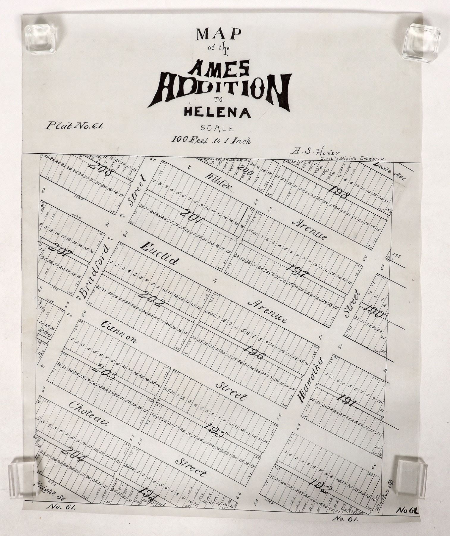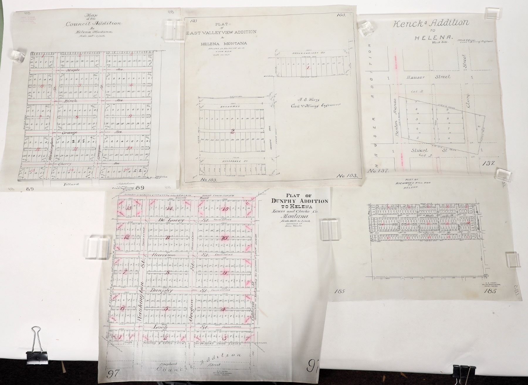A group of 6 original ink-on-linen maps of proposed residential additions to the city of Helena, Montana, dating c. 1890s-1910s. These maps were drawn by civil and mining engineer Albert S. Hovey, with each bearing his name or initials. Maps of the following proposed additions are included: Council, Kenck, Dunphy, Ames, Richmond Hill, and East Valley View. All 6 maps are in great condition with minimal to no wear.