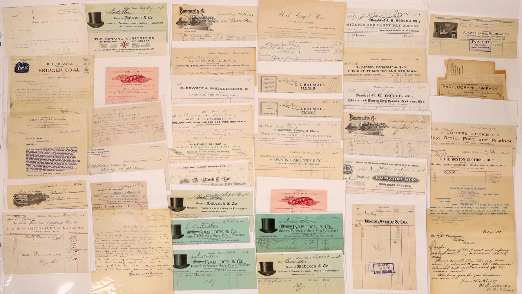 Collection of approximately 110 billheads, letterheads and letters from Helena Montana. Documents include, Tootle Leach & Company, J.R. Boyce Dry Goods & Notions, James Blake Wholesale & Retail Dealer In All Kinds of Meats, Blackburn & Middlemas Pure Crystal Ice, Bach, Cory and Company Wholesale Grocers, Beck's Laundry in and many more. Please see photos for more detail and condition. State:Montana City:Helena Date:1800's-1900's Provenance: Stuart Mackenzie Montana Ephemera Collection