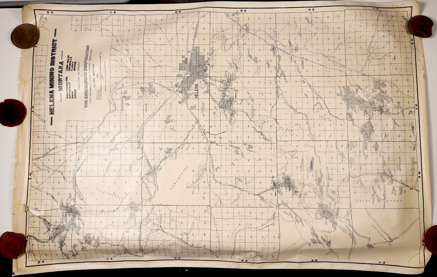 1915 Montana Mining District map by The Engineering Corporation. 61x42". Some edge tears, chip, tape repairs etc. Please inspect. Helena Montana Stuart Mackenzie Montana Ephemera Collection