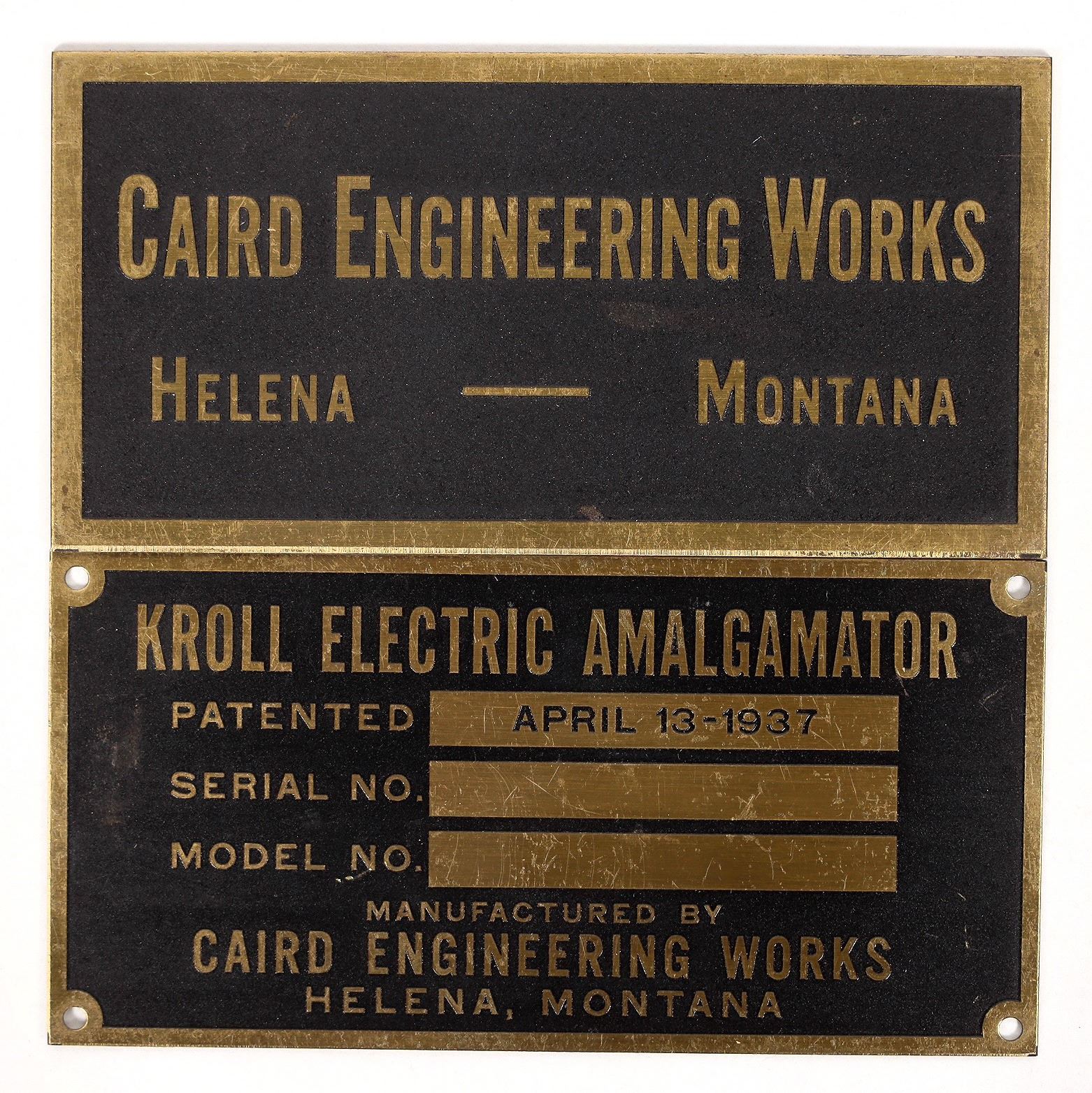 2 2x4" Helena brass plaques. Caird Engineering Works and Kroll Electric Amalgamator. Nice condition.