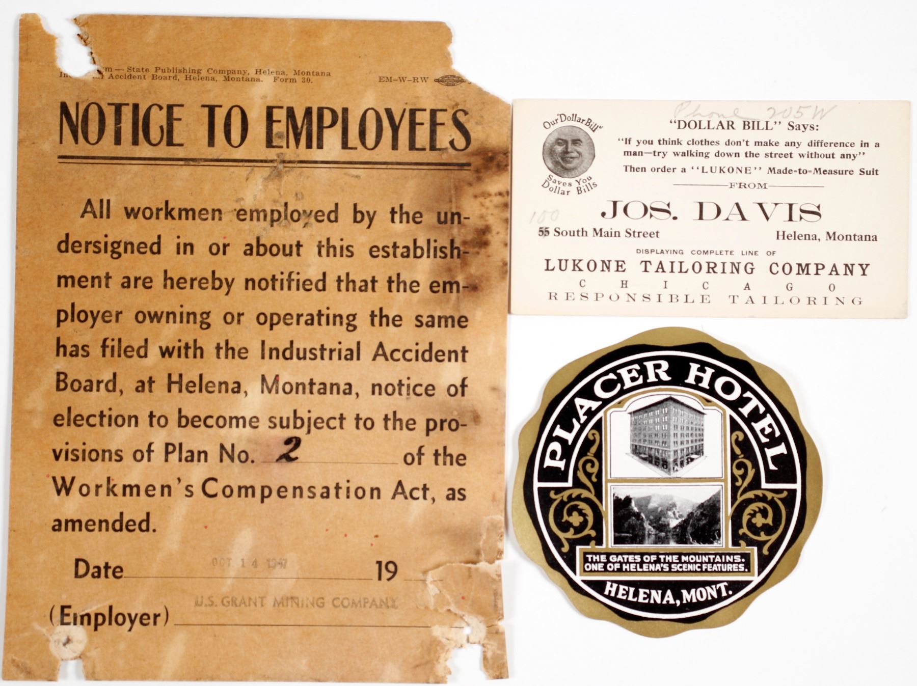 Three items from Helena, Montana, included a 3.75-inch diameter, gummed-back luggage sticker for the Placer Hotel printed in black and gold ink showing the hotel as it appeared after it was built in 1912. John F. Kennedy stayed in the Hotel Placer in 1960, and an arson fire occurred there in May of 1965. It is now the Placer Condo Association. The lot also includes a 4.75x2.625-inch advertising card from Jos. Davis promoting their "made-to-measure suit," and an approximately 6x8-inch Notice To Employees regarding the Workmen's Compensation Act with a date stamp of Oct 14, 1947 (not clear), and name-stamped with U.S. Grant Mining Company at the bottom.