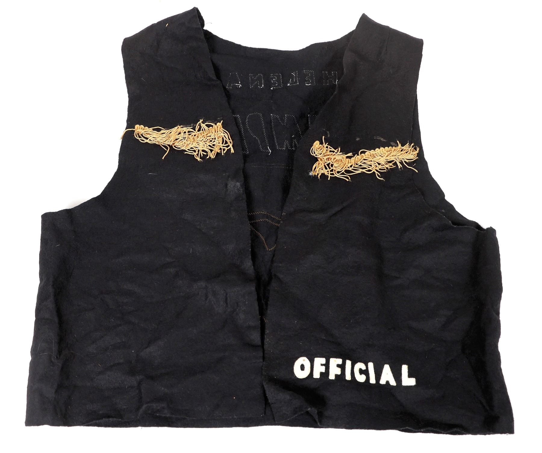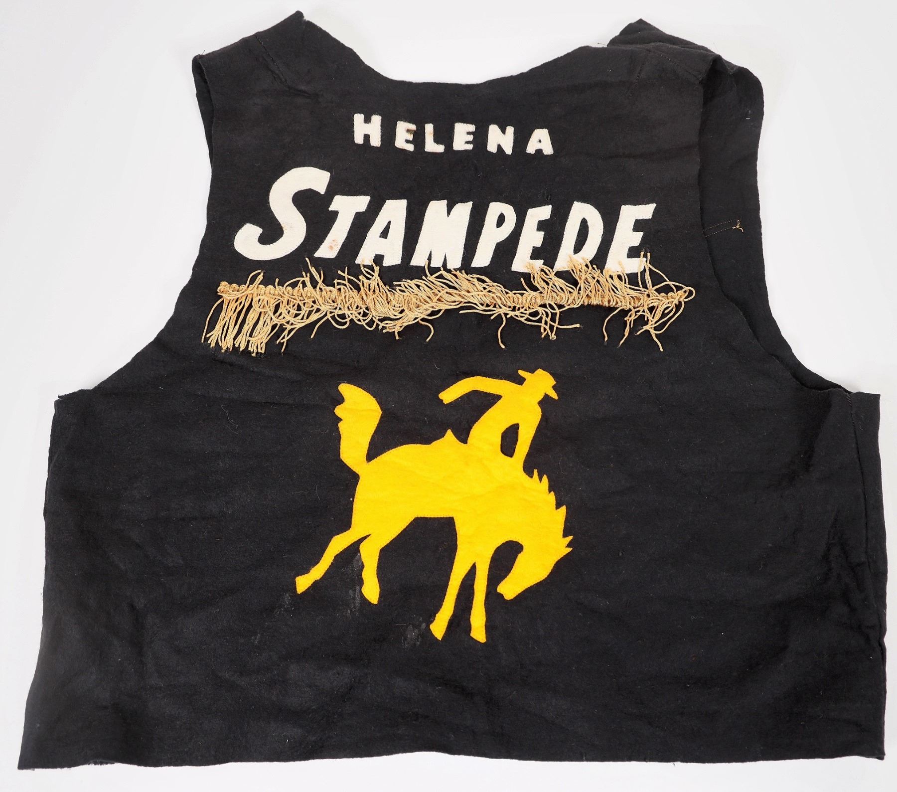 c. 1960's Helena Stampede "Official" hand made vest. Black felt with sewn on gold fringes and bucking bronc on back. 19x21".