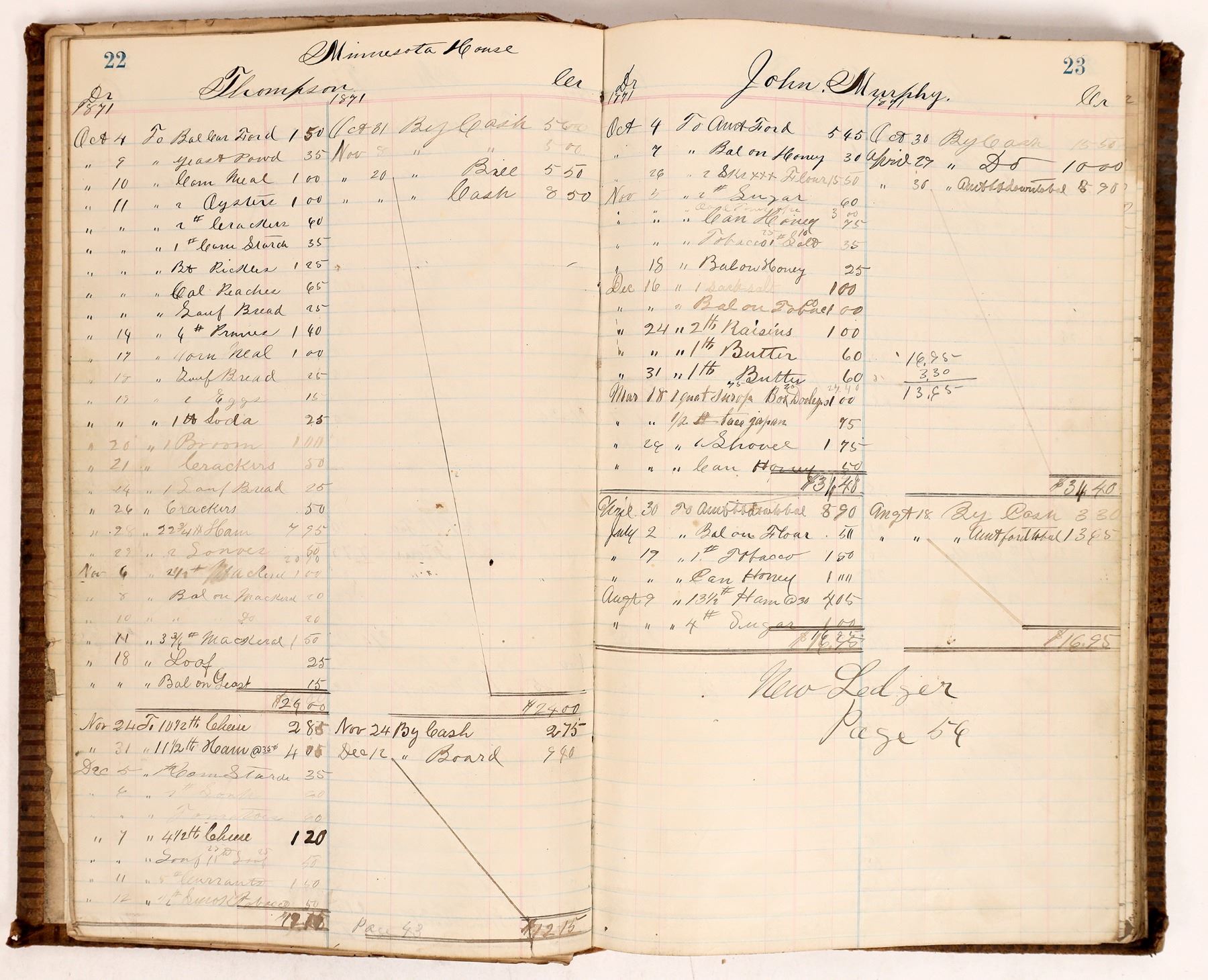 A general store ledger of a Helena, MT store, c. 1873-73. Listings of items purchases. Notecard inside states "this must be a Helena book, Mike Reinig-Helena. Leather cover 12.5x8".