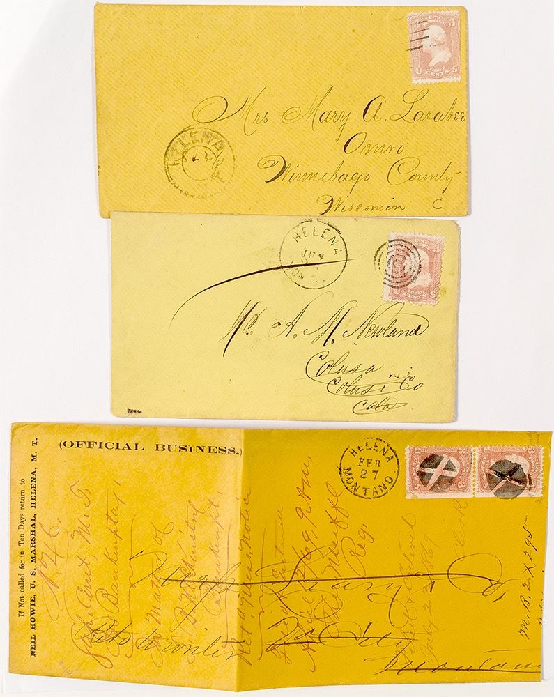 1) Number 1, Number 3, and Number 4 in Shellen & Dunn. Last example is a corner cover from Neil Howie, US Marshall. Contents had pertained to the bankruptcy of FB McKinstrul(?). Howie was not only a Marshall but Brigadier General. His diary and information on his exploits are online! (Svoboda Collection) City: Helena State: Montana Date: c1865 HWAC# 35249