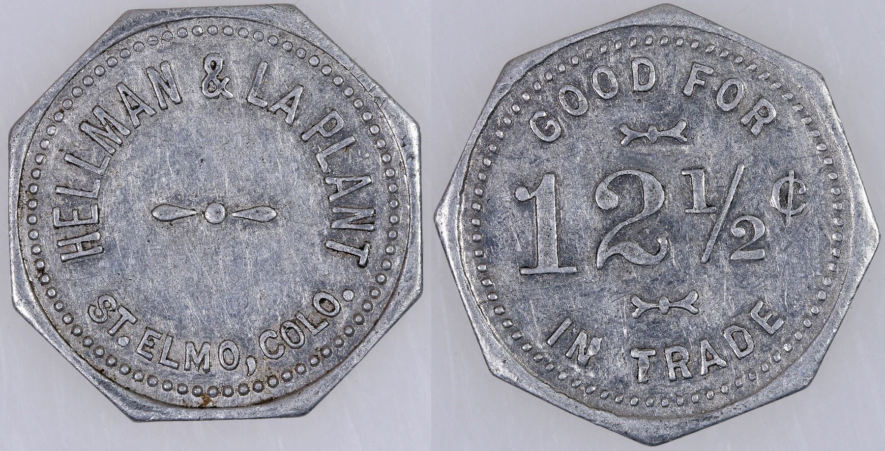 1909-1910 saloon: HELLMAN & LA PLANT / ST. ELMO, COLO. // GOOD FOR / 12Ω¢ / IN TRADE; Al., Octagonal, 25 mm.