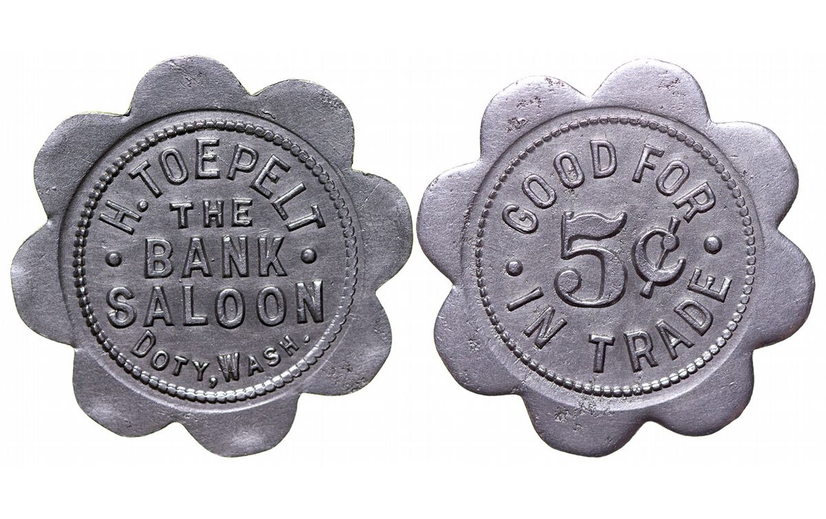 THE BANK SALOON / H. TOEPELT // GF 5c IT (scalloped aluminum 8)City: DotyCounty: State: WADate: