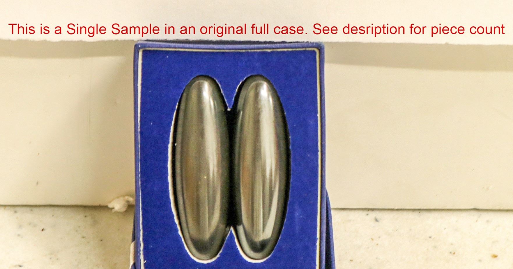 A group of hematite oval shaped hematite pieces, called Rattlesnake Eggs. These measure 2.5"x .5" and come two to a box. There are 100 boxes to a case. These are new. Please see photos for new details.