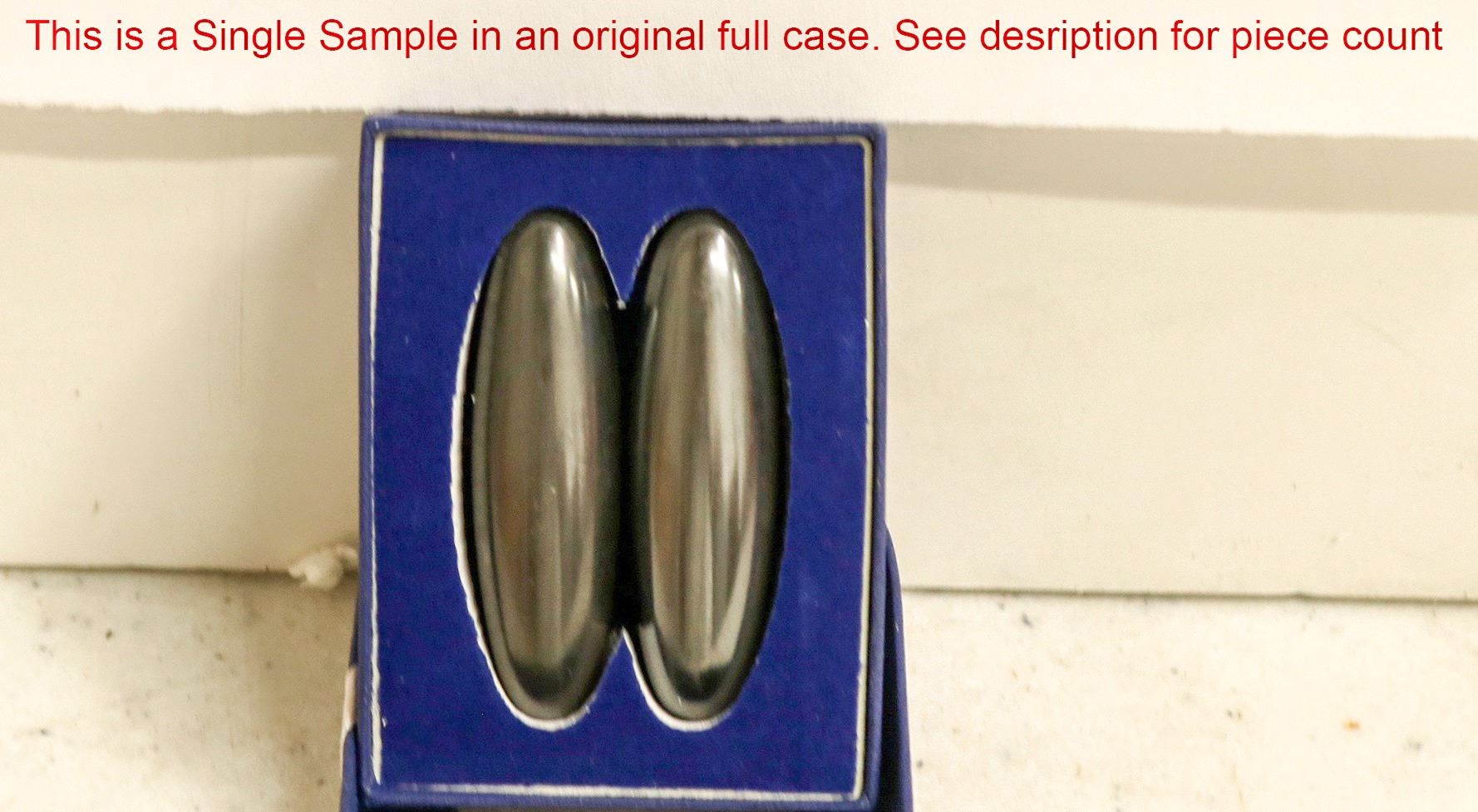 A group of hematite oval shaped hematite pieces, called Rattlesnake Eggs. These measure 2.5"x .5" and come two to a box. There are 100 boxes to a case. These are new. Please see photos for new details.