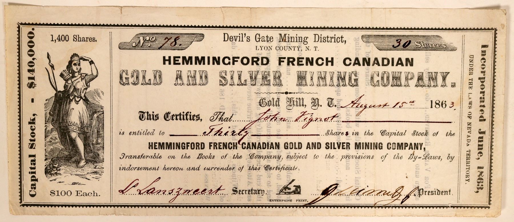 This is a rather unique name! # 78 for 30 shares to John Vignot. Signed by L Lanszweet(?) and president (?). Dateline Gold Hill 1863. Incorporated June 1863. Not cancelled. No stamp. Female allegorial Native American bow wielding stock vignette. Enterprise print. Small rip upper left, small dog ea lower left etc. Very nice! Listed in Collins with Carrie as secretary. Louis Lanszweet was was the superintendent of the Bertola MIll on the Flowery Toll Road according to the 1863 Kelly Directory. This is the certificate used by Mahler. Ken Prag Collection