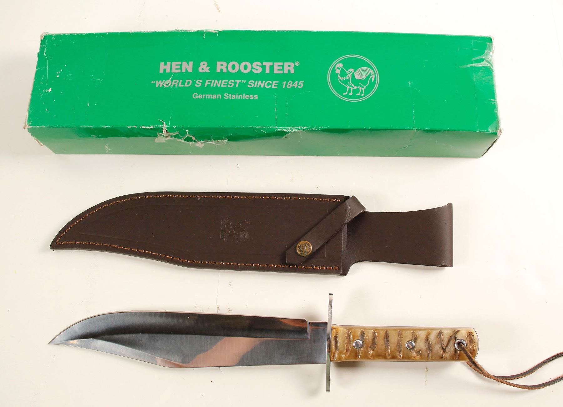 This is a Hen and Rooster Bowie at 15 in. OAL/ 9 3/4 in. stainless steel blade made in Germany assembled in Spain. The grips are sheep horn and well done crafted. Model HR-5033-RH long out of production with sheath. NIB.. Date: City: State: HWAC# 33459